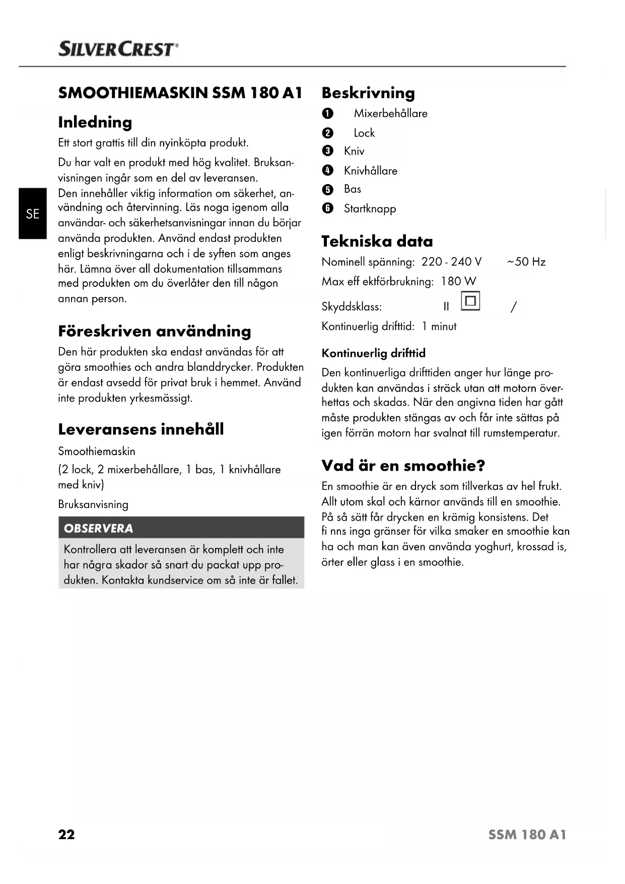 50 Hz Max eff ektförbrukning: 180 W Skyddsklass: II / Kontinuerlig drifttid: 1 minut Kontinuerlig drifttid Den kontinuerliga drifttiden anger hur länge pro- dukten kan användas i sträck utan att motorn över- hettas och skadas. När den angivna tiden har gått måste produkten stängas av och får inte sättas på igen förrän motorn har svalnat till rumstemperatur. Vad är en smoothie? En smoothie är en dryck som tillverkas av hel frukt. Allt utom skal och kärnor används till en smoothie. På så sätt får drycken en krämig konsistens. Det fi nns inga gränser för vilka smaker en smoothie kan ha och man kan även använda yoghurt, krossad is, örter eller glass i en smoothie.23 SSM 180 A1