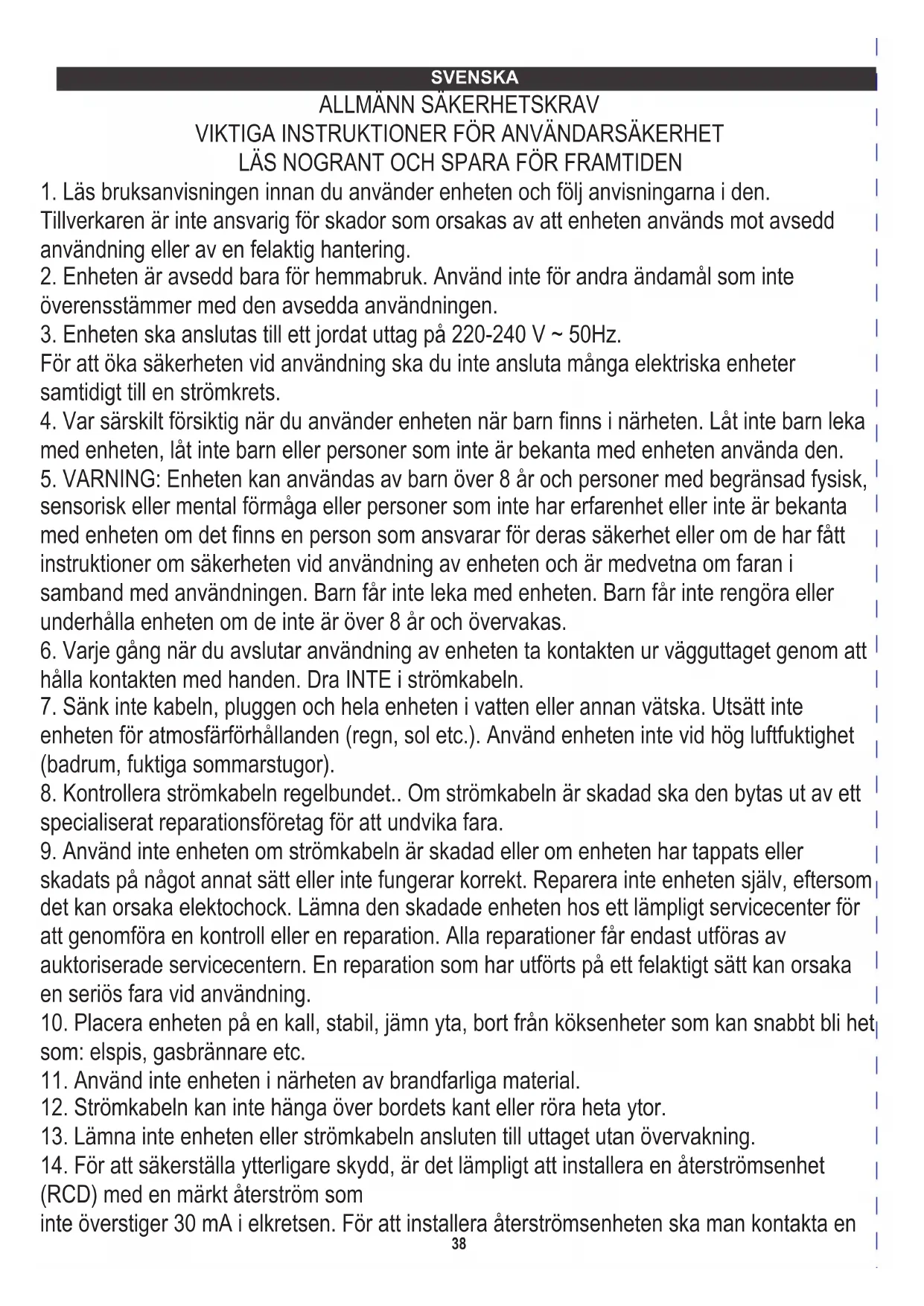 13. Lämna inte enheten eller strömkabeln ansluten till uttaget utan övervakning.
