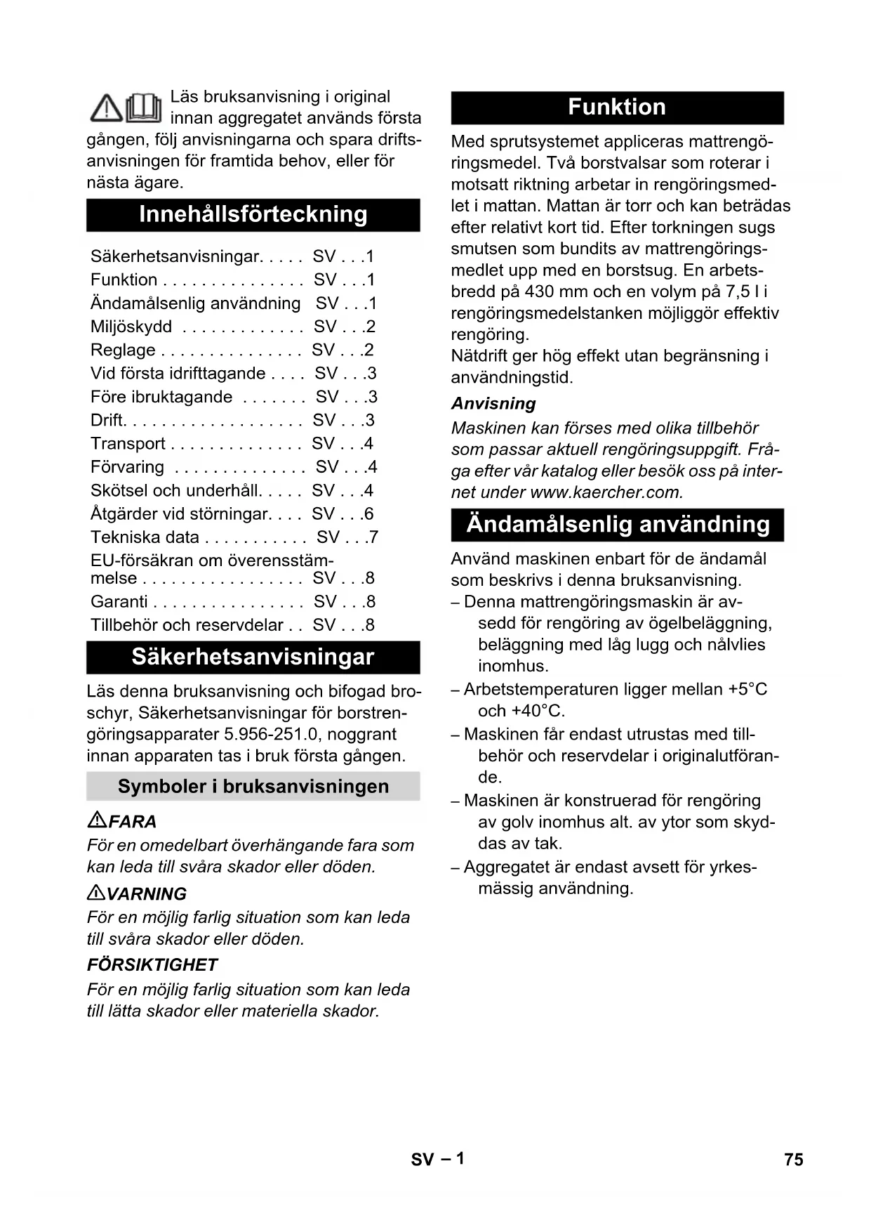 Chairman of the Board of Management Director Regulatory Affairs & Certification Garanti Tilbehør og reservedeler 74 NO– 1 Läs bruksanvisning i original innan aggregatet används första gången, följ anvisningarna och spara drifts- anvisningen för framtida behov, eller för nästa ägare. Läs denna bruksanvisning och bifogad bro- schyr, Säkerhetsanvisningar för borstren- göringsapparater 5.956-251.0, noggrant innan apparaten tas i bruk första gången. FARA För en omedelbart överhängande fara som kan leda till svåra skador eller döden. 몇 VARNING För en möjlig farlig situation som kan leda till svåra skador eller döden. FÖRSIKTIGHET För en möjlig farlig situation som kan leda till lätta skador eller materiella skador. Med sprutsystemet appliceras mattrengö- ringsmedel. Två borstvalsar som roterar i motsatt riktning arbetar in rengöringsmed- let i mattan. Mattan är torr och kan beträdas efter relativt kort tid. Efter torkningen sugs smutsen som bundits av mattrengörings- medlet upp med en borstsug. En arbets- bredd på 430 mm och en volym på 7,5 l i rengöringsmedelstanken möjliggör effektiv rengöring. Nätdrift ger hög effekt utan begränsning i användningstid. Anvisning Maskinen kan förses med olika tillbehör som passar aktuell rengöringsuppgift. Frå- ga efter vår katalog eller besök oss på inter- net under www.kaercher.com. Använd maskinen enbart för de ändamål som beskrivs i denna bruksanvisning. – Denna mattrengöringsmaskin är av- sedd för rengöring av ögelbeläggning, beläggning med låg lugg och nålvlies inomhus. – Arbetstemperaturen ligger mellan +5°C och +40°C. – Maskinen får endast utrustas med till- behör och reservdelar i originalutföran- de. – Maskinen är konstruerad för rengöring av golv inomhus alt. av ytor som skyd- das av tak. – Aggregatet är endast avsett för yrkes- mässig användning. Innehållsförteckning Säkerhetsanvisningar. . . . . SV . . .1 Funktion . . . . . . . . . . . . . . . SV . . .1 Ändamålsenlig användning SV . . .1 Miljöskydd . . . . . . . . . . . . . SV . . .2 Reglage . . . . . . . . . . . . . . . SV . . .2 Vid första idrifttagande . . . . SV . . .3 Före ibruktagande . . . . . . . SV . . .3 Drift. . . . . . . . . . . . . . . . . . . SV . . .3 Transport . . . . . . . . . . . . . . SV . . .4 Förvaring . . . . . . . . . . . . . . SV . . .4 Skötsel och underhåll. . . . . SV . . .4 Åtgärder vid störningar. . . . SV . . .6 Tekniska data . . . . . . . . . . . SV . . .7 EU-försäkran om överensstäm- melse . . . . . . . . . . . . . . . . . SV . . .8 Garanti . . . . . . . . . . . . . . . . SV . . .8 Tillbehör och reservdelar . . SV . . .8 Säkerhetsanvisningar Symboler i bruksanvisningen Funktion Ändamålsenlig användning 75SV– 2 Upplysningar om ingredienser (REACH) Aktuell information om ingredienser finns på: www.kaercher.com/REACH 1 Huvudreglage 2 Knapp Rengöringslösning 3 Skjuthandtag 4 Knapp borstdrift 5 Kabelfäste 6 Rengöringsmedelstank 7 Hållare sprutflaska 8 Låsning skjutbygel 9 Knapp bortsbyte 10 Sopbehållare 11 Sil 12 Utträde rengöringslösning 13 Borstvalsar 14 Överlastsäkring Borstdrift 15 Hållare rengöringsmedelstank 16 Lock Rengöringsmedelstank 17 Koppling rengöringsmedelsslang 18 Munstycke, här tillhandahållet i leve- ranstillstånd 19 Munstycksfäste Miljöskydd Emballagematerialen kan åter- vinnas. Kasta inte emballaget i hushållssoporna utan lämna det till återvinning. Kasserade aggregat innehåller återvinningsbart material som bör gå till återvinning. Batterier, olja och liknande ämnen får inte komma ut i miljön. Överlämna därför skrotade aggregat till lämpligt återvinningssystem. Reglage 76 SV– 3 Bild 1, se omslagssida Ta ur maskinen och skjuthandtaget ur förpackningen och lägg dessa brevid varandra som bilden visar. Bild 2, se omslagssida Upprätta en kabelförbindelse mellan maskinen och skjuthandtaget. Skjut in anslutningsdonet i skjutbygeln. Bild 3, se omslagssida När skjutbygeln sätts fast på maskinen, justera maskinkabeln genom öppning- en i skjuthandtaget så att den är inte kläms. Bild 4, se omslagssida Skjut fast skjuthandtaget helt på maski- nen. Skruva i de tre bifogade skruvarna och drag fast dem. Fyll på vatten i rengöringsmedelstan- ken. Anslut nätkontakt till vägguttag. Ställ huvudreglaget på "I". Tryck in knappen rengöringslösning och spola igenom vattensystemet. Ställ huvudreglaget på "0". Dra ut nätkontakten ur vägguttaget. Ställ skjuthandtaget lodrätt och haka fast det. Tippa maskinen bakåt och lägg den mot skjuthandtaget. Stick på borstvalsen på griparen och haka fast den på motsatt sida. FARA Risk för skada på grund av elektrisk stöt. Kontrollera att aggregatets nätkabel är felfri före varje användning. Använd inte aggre- gat med skadad kabel. Låt elektriker byta ut skadad kabel. Risk för skada på grund av elektrisk stöt på grund av en skadad nätkabel. Låt inte nät- anslutningskabeln komma i kontakt med de roterande borstarna eller pads. MEDDELANDE Ställ huvudströmbrytaren i läge "0" för att avbryta borstdriften omedelbart. Ställ skjuthandtaget lodrätt och haka fast det. Tippa maskinen bakåt på hjulen och skjut den till arbetsstället. FÖRSIKTIGHET Skaderisk. Använd endast rekommendera- de rengöringsmedel. Med andra rengö- ringsmedel ansvarar användaren för den ökade risken med avseende på driftssäker- het och olycksrisk, samt reducerad brukstid för maskinen. Använd endast rengörings- medel som inte innehåller lösningsmedel, salt och oxider. Beakta säkerhetsanvisningarna på rengö- ringsmedlen. Bearbeta inga antändliga, explosiva, frä- tande eller giftiga driv- och hjälpmedel. MEDDELANDE Beakta doseringsanvisningar. Rekommenderade rengöringsmedel: Dosering 6 %: Vid första idrifttagande Före ibruktagande Montera borstar Drift Köra maskinen Fylla på bränsle Användning Rengöringsme- del Mellanrengöring av mattor RM 76