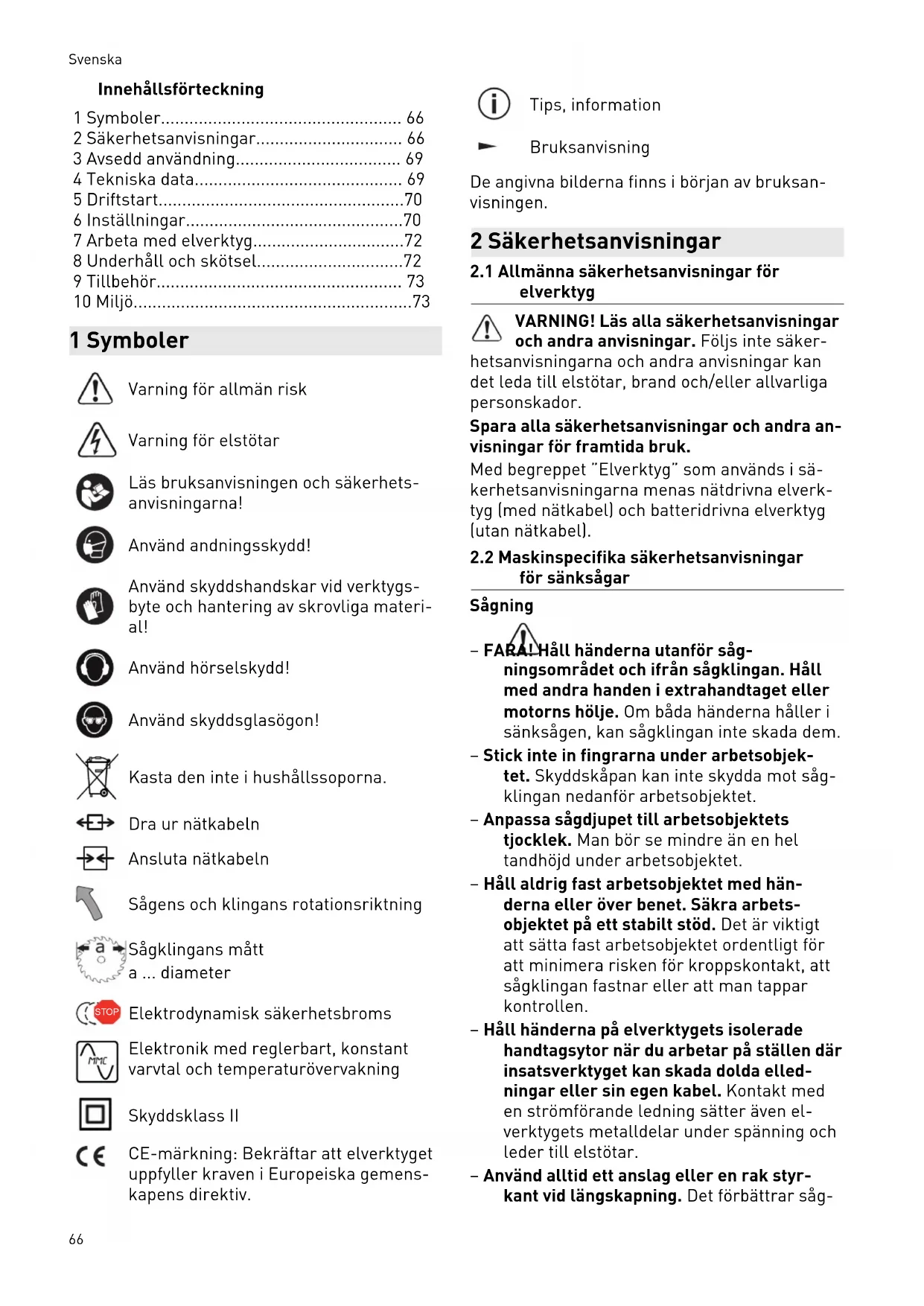 De angivna emissionsvärdena (vibration, oljud) – används för maskinjämförelse, – kan även användas för preliminär upp skattning av vibrations- och bullernivån un der arbetet, – representerar elverktygets huvudsakliga användningsområden. OBS! Emissionsvärdena kan avvika från de angiv na värdena. Det beror på hur verktyget an vänds och typen av arbetsobjekt. ► Man måste bedöma den faktiska belas tningen under hela driftcykeln. ► Beroende på den faktiska belastningen måste lämpliga säkerhetsåtgärder vidtas för att skydda användarna. 3 Avsedd användning Sänksågarna är avsedda för sågning av trä, trä liknande material, gips- och cementbundna fi bermaterial samt plast. Med Festools special sågklingor för aluminium kan maskinerna även användas för att såga aluminium. Asbesthaltiga material får inte sågas. Använd inte kap- eller slipskivor. Detta elverktyg får uteslutande användas av fackmän eller därtill undervisade personer. Elverktyg från Festool får endast monteras på arbetsbord som är avsedda för detta. Om de monteras på andra arbetsbord eller egentill verkade bord kan elverktygen bli instabila och orsaka svåra olyckor. Vid felaktig användning ligger ansvaret på användaren.