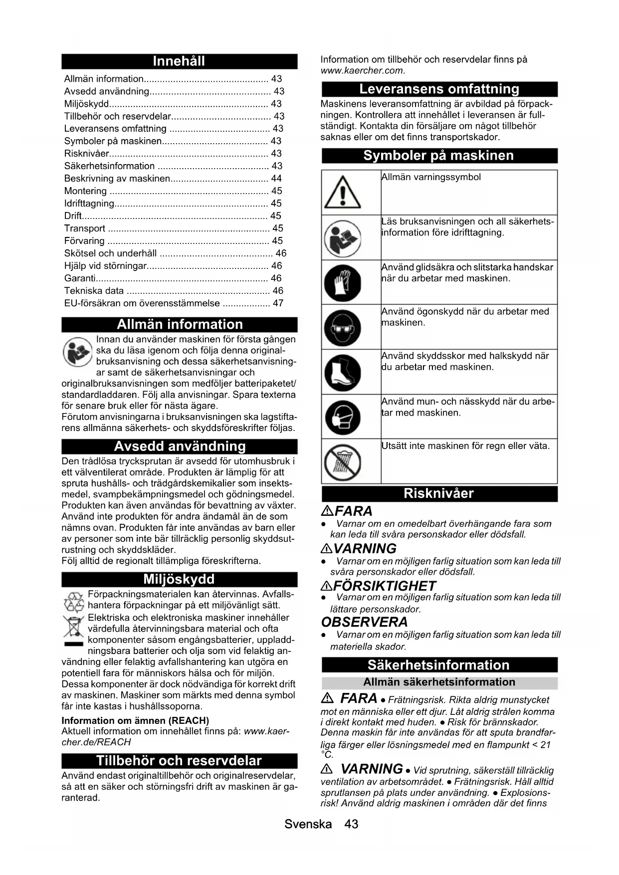 • <2,5 Çalışma basıncı (maks.) bar 3 Pompalama miktarı (maks.) l/h 30 Boyutlar ve ağırlıklar Hortum uzunluğucm120 Teleskopik püskürtme borusunun uzunluğu cm 45 - 75 Ağırlık (akü paketi hariç) kg 2,4 Uzunluk x genişlik x yükseklik mm 750 x 185 x 365Svenska 43 Innehåll Allmän information Innan du använder maskinen för första gången ska du läsa igenom och följa denna original- bruksanvisning och dessa säkerhetsanvisning- ar samt de säkerhetsanvisningar och originalbruksanvisningen som medföljer batteripaketet/ standardladdaren. Följ alla anvisningar. Spara texterna för senare bruk eller för nästa ägare. Förutom anvisningarna i bruksanvisningen ska lagstifta- rens allmänna säkerhets- och skyddsföreskrifter följas. Avsedd användning Den trådlösa trycksprutan är avsedd för utomhusbruk i ett välventilerat område. Produkten är lämplig för att spruta hushålls- och trädgårdskemikalier som insekts- medel, svampbekämpningsmedel och gödningsmedel. Produkten kan även användas för bevattning av växter. Använd inte produkten för andra ändamål än de som nämns ovan. Produkten får inte användas av barn eller av personer som inte bär tillräcklig personlig skyddsut- rustning och skyddskläder. Följ alltid de regionalt tillämpliga föreskrifterna. Miljöskydd Förpackningsmaterialen kan återvinnas. Avfalls- hantera förpackningar på ett miljövänligt sätt. Elektriska och elektroniska maskiner innehåller värdefulla återvinningsbara material och ofta komponenter såsom engångsbatterier, uppladd- ningsbara batterier och olja som vid felaktig an- vändning eller felaktig avfallshantering kan utgöra en potentiell fara för människors hälsa och för miljön. Dessa komponenter är dock nödvändiga för korrekt drift av maskinen. Maskiner som märkts med denna symbol får inte kastas i hushållssoporna. Information om ämnen (REACH) Aktuell information om innehållet finns på: www.kaer- cher.de/REACH Tillbehör och reservdelar Använd endast originaltillbehör och originalreservdelar, så att en säker och störningsfri drift av maskinen är ga- ranterad. Information om tillbehör och reservdelar finns på www.kaercher.com. Leveransens omfattning Maskinens leveransomfattning är avbildad på förpack- ningen. Kontrollera att innehållet i leveransen är full- ständigt. Kontakta din försäljare om något tillbehör saknas eller om det finns transportskador. Symboler på maskinen Risknivåer FARA ● Varnar om en omedelbart överhängande fara som kan leda till svåra personskador eller dödsfall. 몇 VARNING ● Varnar om en möjligen farlig situation som kan leda till svåra personskador eller dödsfall. 몇 FÖRSIKTIGHET ● Varnar om en möjligen farlig situation som kan leda till lättare personskador. OBSERVERA ● Varnar om en möjligen farlig situation som kan leda till materiella skador. Säkerhetsinformation Allmän säkerhetsinformation FARA ● Frätningsrisk. Rikta aldrig munstycket mot en människa eller ett djur. Låt aldrig strålen komma i direkt kontakt med huden. ● Risk för brännskador. Denna maskin får inte användas för att sputa brandfar- liga färger eller lösningsmedel med en flampunkt < 21 °C. 몇 VARNING ● Vid sprutning, säkerställ tillräcklig ventilation av arbetsområdet. ● Frätningsrisk. Håll alltid sprutlansen på plats under användning. ● Explosions- risk! Använd aldrig maskinen i områden där det finns Allmän information p. 43
