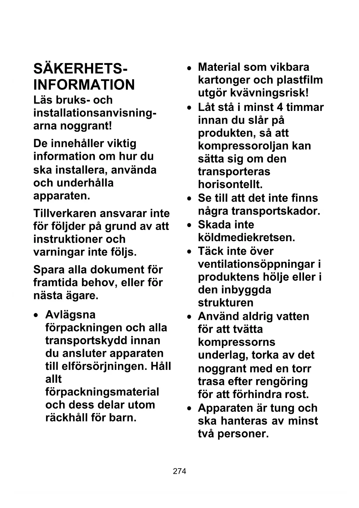 Låt stå i minst 4 timmar innan du slår på produkten, så att kompressoroljan kan sätta sig om den transporteras horisontellt.
