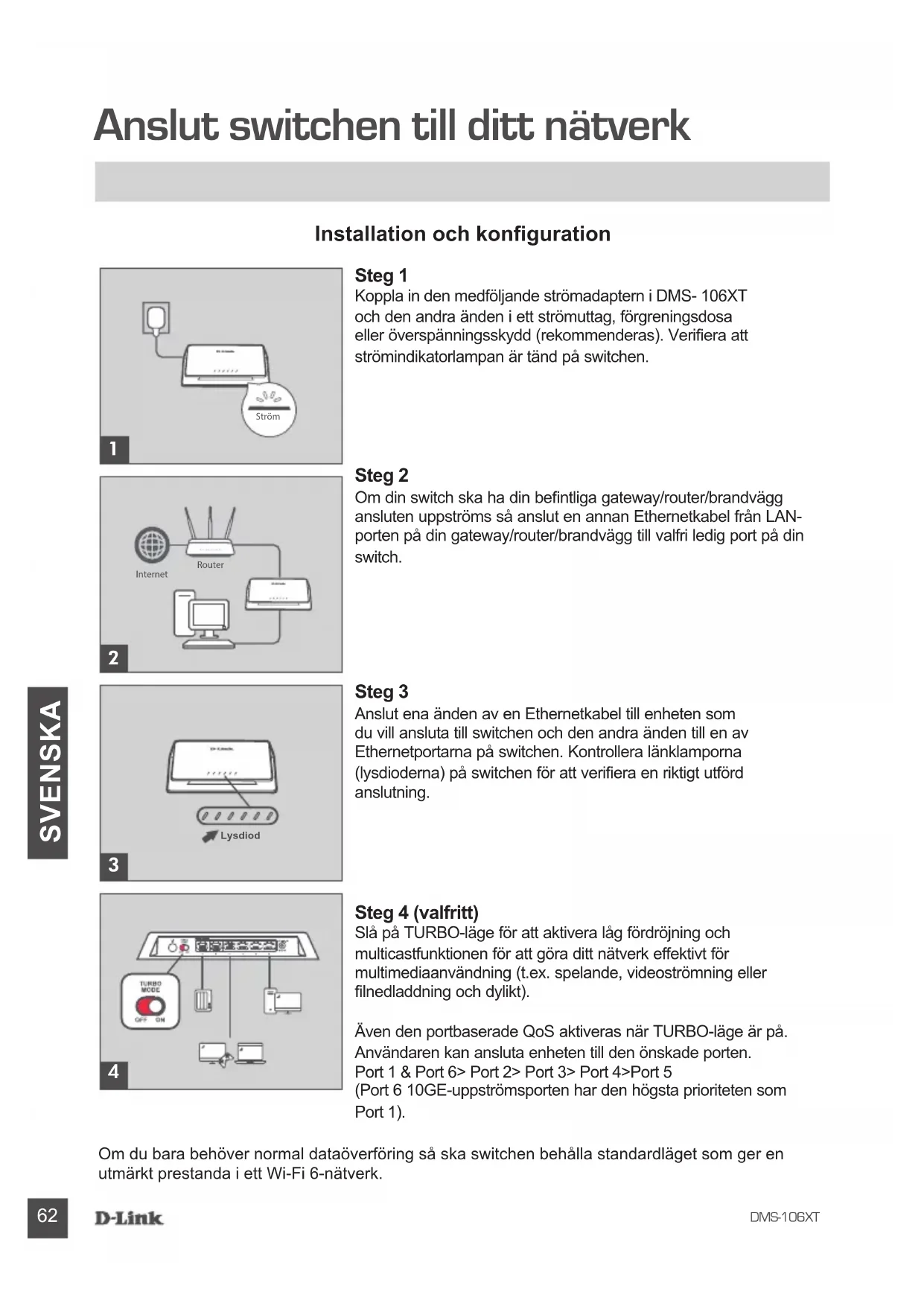 SVENSKA Anslut switchen till ditt nätverk Om du bara behöver normal dataöverföring så ska switchen behålla standardläget som ger en utmärkt prestanda i ett Wi-Fi 6-nätverk. Steg 1 Koppla in den medföljande strömadaptern i DMS- 106XT och den andra änden i ett strömuttag, förgreningsdosa eller överspänningsskydd (rekommenderas). Veriera att strömindikatorlampan är tänd på switchen. Steg 2 Om din switch ska ha din bentliga gateway/router/brandvägg ansluten uppströms så anslut en annan Ethernetkabel från LAN-porten på din gateway/router/brandvägg till valfri ledig port på din switch. Steg 3 Anslut ena änden av en Ethernetkabel till enheten som du vill ansluta till switchen och den andra änden till en av Ethernetportarna på switchen. Kontrollera länklamporna (lysdioderna) på switchen för att veriera en riktigt utförd anslutning. Steg 4 (valfritt) Slå på TURBO-läge för att aktivera låg fördröjning och multicastfunktionen för att göra ditt nätverk effektivt för multimediaanvändning (t.ex. spelande, videoströmning eller lnedladdning och dylikt). Även den portbaserade QoS aktiveras när TURBO-läge är på. Användaren kan ansluta enheten till den önskade porten. Port 1 & Port 6> Port 2> Port 3> Port 4>Port 5 (Port 6 10GE-uppströmsporten har den högsta prioriteten som Port 1). Installation och konguration