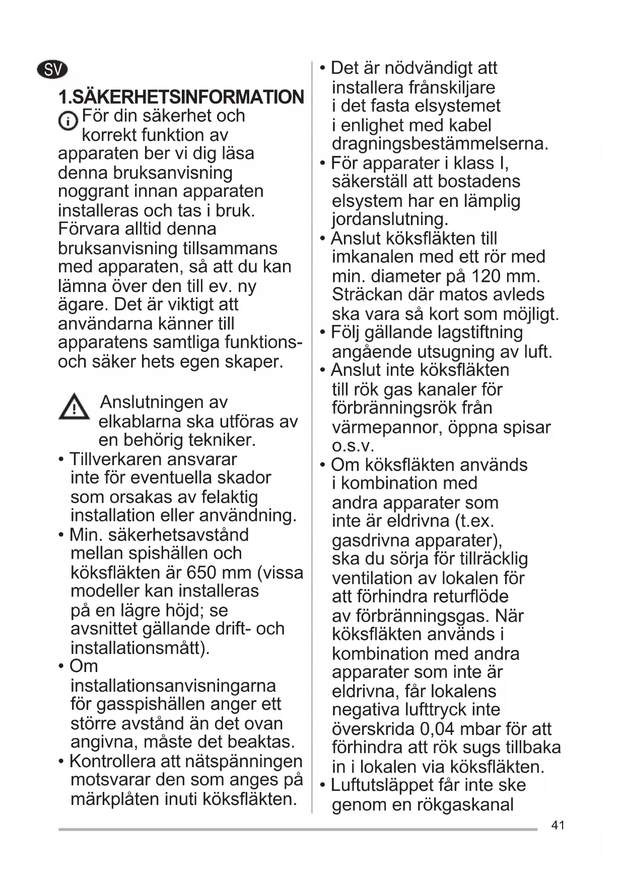 - Neem voor de vervanging contact op met de klantenservice (‘Wend u voor de aankoop tot de klantenservice’).41 1.SÄKERHETSINFORMATION För din säkerhet och korrekt funktion av apparaten ber vi dig läsa denna bruksanvisning noggrant innan apparaten installeras och tas i bruk. Förvara alltid denna bruksanvisning tillsammans med apparaten, så att du kan lämna över den till ev. ny ägare. Det är viktigt att användarna känner till apparatens samtliga funktions- och säker hets egen skaper. Anslutningen av elkablarna ska utföras av en behörig tekniker.