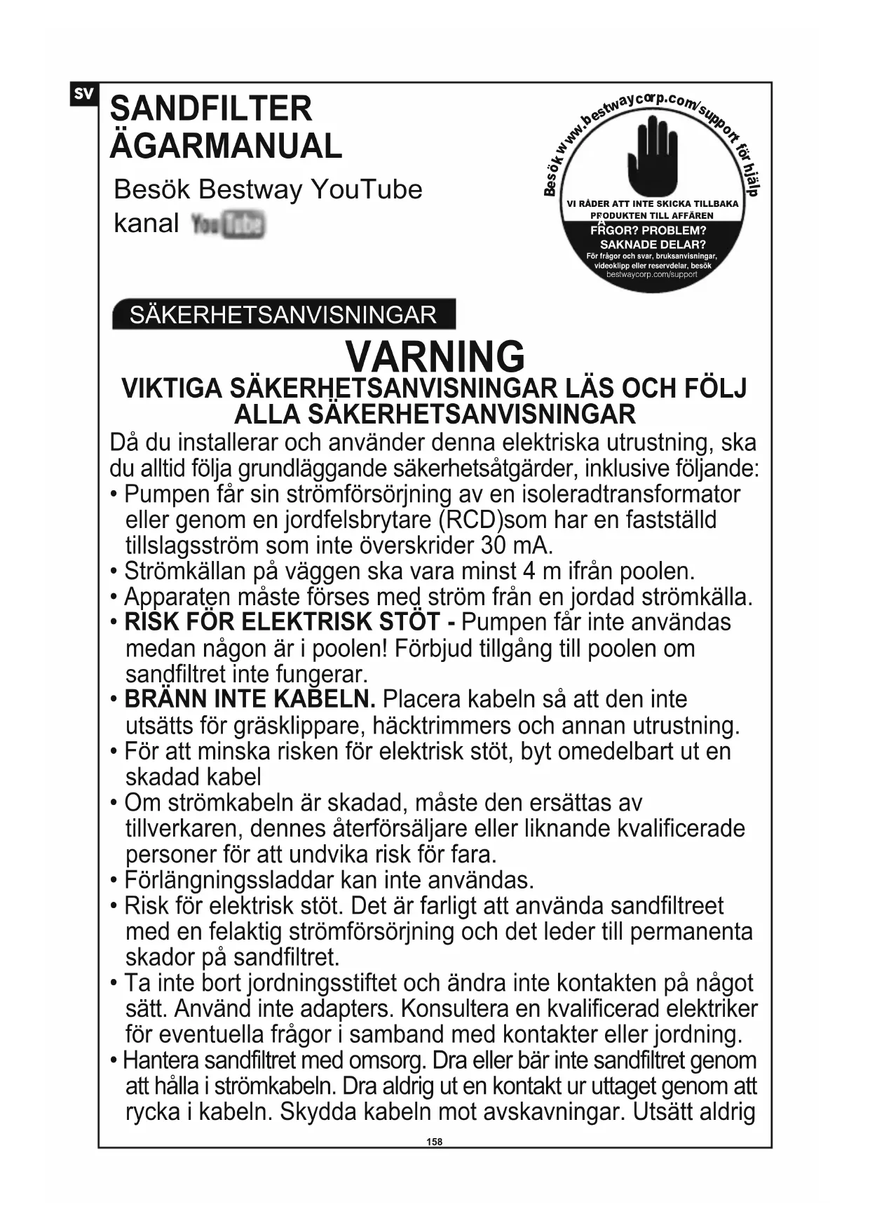 - Hantera sandfiltret med omsorg. Dra eller bär inte sandfiltret genom att hålla i strömkabeln. Dra aldrig ut en kontakt ur uttaget genom att rycka i kabeln. Skydda kabeln mot avskavningar. Utsätt aldrig SANDFILTER ÄGARMANUAL SÄKERHETSANVISNINGAR Besök Bestway YouTube kanal VI RÅDER ATT INTE SKICKA TILLBAKAPRODUKTEN TILL AFFÄREN-9ࠫ.69&796)3,4&:(25(+,+,3(9&För frågor och svar, bruksanvisningar,videoklipp eller reservdelar, besök bestwaycorp.com/support
