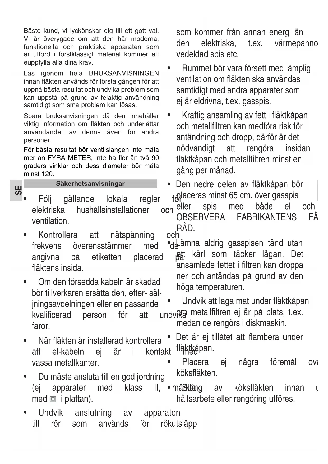 • Dinfläktäravseddförhushållsbruk och endast för ventilation och filtrering av os från matlagning. Att använda köksfläkten för andra ändamal är under ditt eget ansvar ochkanvarafarligt.Fabrikantengör sigejansvarigförskadoruppkomna vidfelaktigtbrukavköksfläkten.