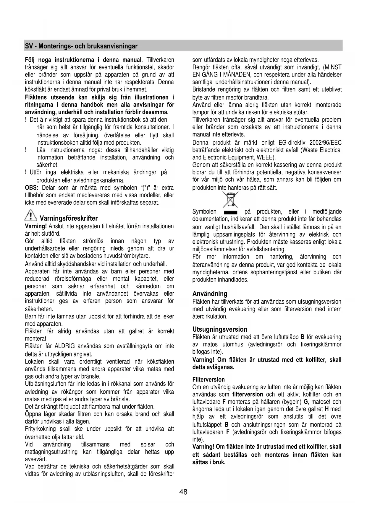 Dersom belysningen ikke skulle virke, kontroller at lyspærene er satt korrekt på plass før du henvender deg til teknisk assistanse.48 SV - Monterings- och bruksanvisningar Följ noga instruktionerna i denna manual. Tillverkaren frånsäger sig allt ansvar för eventuella funktionsfel, skador eller bränder som uppstår på apparaten på grund av att instruktionerna i denna manual inte har respekterats. Denna köksfläkt är endast ämnad för privat bruk i hemmet. Fläktens utseende kan skilja sig från illustrationen i ritningarna i denna handbok men alla anvisningar för användning, underhåll och installation förblir desamma. ! Det ä r viktigt att spara denna instruktionsbok så att den när som helst är tillgänglig för framtida konsultationer. I händelse av försäljning, överlåtelse eller flytt skall instruktionsboken alltid följa med produkten. ! Läs instruktionerna noga: dessa tillhandahåller viktig information beträffande installation, användning och säkerhet. ! Utför inga elektriska eller mekaniska ändringar på produkten eller avledningskanalerna. OBS: Delar som är märkta med symbolen “(*)” är extra tillbehör som endast medlevereras med vissa modeller, eller icke medlevererade delar som skall införskaffas separat. Varningsföreskrifter Varning! Anslut inte apparaten till elnätet förrän installationen är helt slutförd. Gör alltid fläkten strömlös innan någon typ av underhållsarbete eller rengöring inleds genom att dra ur kontakten eller slå av bostadens huvudströmbrytare. Använd alltid skyddshandskar vid installation och underhåll. Apparaten får inte användas av barn eller personer med reducerad rörelseförmåga eller mental kapacitet, eller personer som saknar erfarenhet och kännedom om apparaten, såtillvida inte användandet övervakas eller instruktioner ges av erfaren person som ansvarar för säkerheten. Barn får inte lämnas utan uppsikt för att förhindra att de leker med apparaten. Fläkten får alridg användas utan att gallret är korrekt monterat! Fläkten får ALDRIG användas som avställningsyta om inte detta är uttryckligen angivet. Lokalen skall vara ordentligt ventilerad när köksfläkten används tillsammans med andra apparater vilka matas med gas och andra typer av bränsle. Utblåsningsluften får inte ledas in i rökkanal som används för avledning av rökångor som kommer från apparater vilka matas med gas eller andra typer av bränsle. Det är strängt förbjudet att flambera mat under fläkten. Öppna lågor skadar filtren och kan orsaka brand och skall därför undvikas i alla lägen. Frityrkokning skall ske under uppsikt för att undvika att överhettad olja fattar eld. Vid användning tillsammans med spisar och matlagningsutrustning kan tillgängliga delar hettas upp avsevärt. Vad beträffar de tekniska och säkerhetsåtgärder som skall vidtas för avledning av utblåsningsluften, skall de föreskrifter som utfärdats av lokala myndigheter noga efterlevas. Rengör fläkten ofta, såväl utvändigt som invändigt, (MINST EN GÅNG I MÅNADEN, och respektera under alla händelser samtliga underhållsinstruktioner i denna manual). Bristande rengöring av fläkten och filtren samt ett uteblivet byte av filtren medför brandfara. Använd eller lämna aldrig fläkten utan korrekt imonterade lampor för att undvika risken för elektriska stötar. Tillverkaren frånsäger sig allt ansvar för eventuella problem eller bränder som orsakats av att instruktionerna i denna manual inte efterlevts. Denna produkt är märkt enligt EG-direktiv 2002/96/EEC beträffande elektriskt och elektroniskt avfall (Waste Electrical and Electronic Equipment, WEEE). Genom att säkerställa en korrekt kassering av denna produkt bidrar du till att förhindra potentiella, negativa konsekvenser för vår miljö och vår hälsa, som annars kan bli följden om produkten inte hanteras på rätt sätt. Symbolen på produkten, eller i medföljande dokumentation, indikerar att denna produkt inte får behandlas som vanligt hushållsavfall. Den skall i stället lämnas in på en lämplig uppsamlingsplats för återvinning av elektrisk och elektronisk utrustning. Produkten måste kasseras enligt lokala miljöbestämmelser för avfallshantering. För mer information om hantering, återvinning och återanvändning av denna produkt, var god kontakta de lokala myndigheterna, ortens sophanteringstjänst eller butiken där produkten inhandlades. Användning Fläkten har tillverkats för att användas som utsugningsversion med utvändig evakuering eller som filterversion med intern återcirkulation. Utsugningsversion Fläkten är utrustad med ett övre luftutsläpp B för evakuering av matos utomhus (avledningsrör och fixeringsklämmor bifogas inte). Varning! Om fläkten är utrustad med ett kolfilter, skall detta avlägsnas. Filterversion Om en utvändig evakuering av luften inte är möjlig kan fläkten användas som filterversion och ett aktivt kolfilter och en luftavledare F monteras på hållaren (bygeln) G, matoset och ångorna leds ut i lokalen igen genom det övre gallret H med hjälp av ett avledningsrör som anslutits till det övre luftutsläppet B och anslutningsringen som är monterad på luftavledaren F (avledningsrör och fixeringsklämmor bifogas inte). Varning! Om fläkten inte är utrustad med ett kolfilter, skall ett sådant beställas och monteras innan fläkten kan sättas i bruk.49 De modeller som saknar utsugningsmotor fungerar endast som utsugningsversion och skall anslutas till en fristående utsugningsenhet (bifogas icke). Anslutningsinstruktionerna bifogas med den utvändiga utblåsenheten. Installation Minsta tillåtna avstånd mellan kokkärlens stödyta på spishällen och köksfläktes underkant är 50cm om det är frågan om en elektrisk spis och 65cm om det är frågan om gasspis eller kombinerad gashäll. Om spishällens instruktioner anger ett större avstånd skall detta respekteras.