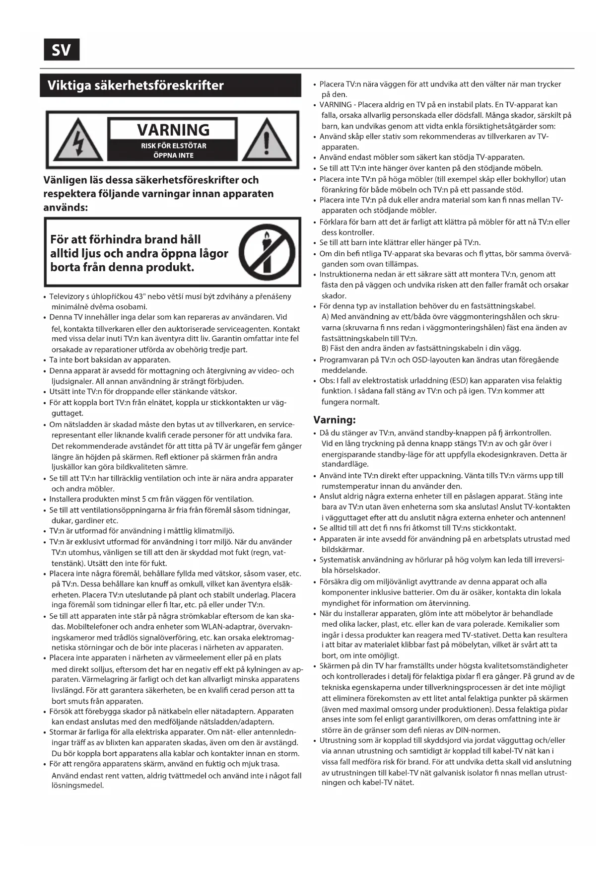 - Televizory s úhlopříčkou 43" nebo větší musí být zdvihány a přenášeny minimálně dvěma osobami.• Denna TV innehåller inga delar som kan repareras av användaren. Vid fel, kontakta tillverkaren eller den auktoriserade serviceagenten. Kontakt med vissa delar inuti TV:n kan äventyra ditt liv. Garantin omfattar inte fel orsakade av reparationer utförda av obehörig tredje part.• Ta inte bort baksidan av apparaten.• Denna apparat är avsedd för mottagning och återgivning av video- och ljudsignaler. All annan användning är strängt förbjuden.• Utsätt inte TV:n för droppande eller stänkande vätskor.• För att koppla bort TV:n från elnätet, koppla ur stickkontakten ur väg-guttaget.• Om nätsladden är skadad måste den bytas ut av tillverkaren, en service-representant eller liknande kvali cerade personer för att undvika fara.Det rekommenderade avståndet för att titta på TV är ungefär fem gånger längre än höjden på skärmen. Re ektioner på skärmen från andra ljuskällor kan göra bildkvaliteten sämre.• Se till att TV:n har tillräcklig ventilation och inte är nära andra apparater och andra möbler.• Installera produkten minst 5 cm från väggen för ventilation.• Se till att ventilationsöppningarna är fria från föremål såsom tidningar, dukar, gardiner etc.• TV:n är utformad för användning imåttlig klimatmiljö.• TV:n är exklusivt utformad för användning itorr miljö. När du använder TV:n utomhus, vänligen se till att den är skyddad mot fukt (regn, vat-tenstänk). Utsätt den inte för fukt.• Placera inte några föremål, behållare fyllda med vätskor, såsom vaser, etc. på TV:n. Dessa behållare kan knuff as omkull, vilket kan äventyra elsäk-erheten. Placera TV:n uteslutande på plant och stabilt underlag. Placera inga föremål som tidningar eller ltar, etc. på eller under TV:n.• Se till att apparaten inte står på några strömkablar eftersom de kan ska-das. Mobiltelefoner och andra enheter som WLAN-adaptrar, övervakn-ingskameror med trådlös signalöverföring, etc. kan orsaka elektromag-netiska störningar och de bör inte placeras inärheten av apparaten.• Placera inte apparaten inärheten av värmeelement eller på en plats med direkt solljus, eftersom det har en negativ eff ekt på kylningen av ap-paraten. Värmelagring är farligt och det kan allvarligt minska apparatens livslängd. För att garantera säkerheten, be en kvali cerad person att ta bort smuts från apparaten.• Försök att förebygga skador på nätkabeln eller nätadaptern. Apparaten kan endast anslutas med den medföljande nätsladden/adaptern.• Stormar är farliga för alla elektriska apparater. Om nät- eller antennledn-ingar träff as av blixten kan apparaten skadas, även om den är avstängd. Du bör koppla bort apparatens alla kablar och kontakter innan en storm.• För att rengöra apparatens skärm, använd en fuktig och mjuk trasa. Använd endast rent vatten, aldrig tvättmedel och använd inte inågot fall lösningsmedel.• Placera TV:n nära väggen för att undvika att den välter när man trycker på den.• VARNING - Placera aldrig en TV på en instabil plats. En TV-apparat kan falla, orsaka allvarlig personskada eller dödsfall. Många skador, särskilt på barn, kan undvikas genom att vidta enkla försiktighetsåtgärder som:• Använd skåp eller stativ som rekommenderas av tillverkaren av TV-apparaten.• Använd endast möbler som säkert kan stödja TV-apparaten.• Se till att TV:n inte hänger över kanten på den stödjande möbeln.• Placera inte TV:n på höga möbler (till exempel skåp eller bokhyllor) utan förankring för både möbeln och TV:n på ett passande stöd.• Placera inte TV:n på duk eller andra material som kan nnas mellan TV-apparaten och stödjande möbler.• Förklara för barn att det är farligt att klättra på möbler för att nå TV:n eller dess kontroller.• Se till att barn inte klättrar eller hänger på TV:n.• Om din be ntliga TV-apparat ska bevaras och yttas, bör samma övervä-ganden som ovan tillämpas.• Instruktionerna nedan är ett säkrare sätt att montera TV:n, genom att fästa den på väggen och undvika risken att den faller framåt och orsakar skador.• För denna typ av installation behöver du en fastsättningskabel.A) Med användning av ett/båda övre väggmonteringshålen och skru-varna (skruvarna nns redan iväggmonteringshålen) fäst ena änden av fastsättningskabeln till TV:n.B) Fäst den andra änden av fastsättningskabeln idin vägg.• Programvaran på TV:n och OSD-layouten kan ändras utan föregående meddelande.• Obs: I fall av elektrostatisk urladdning (ESD) kan apparaten visa felaktig funktion. I sådana fall stäng av TV:n och på igen. TV:n kommer att fungera normalt. Varning: