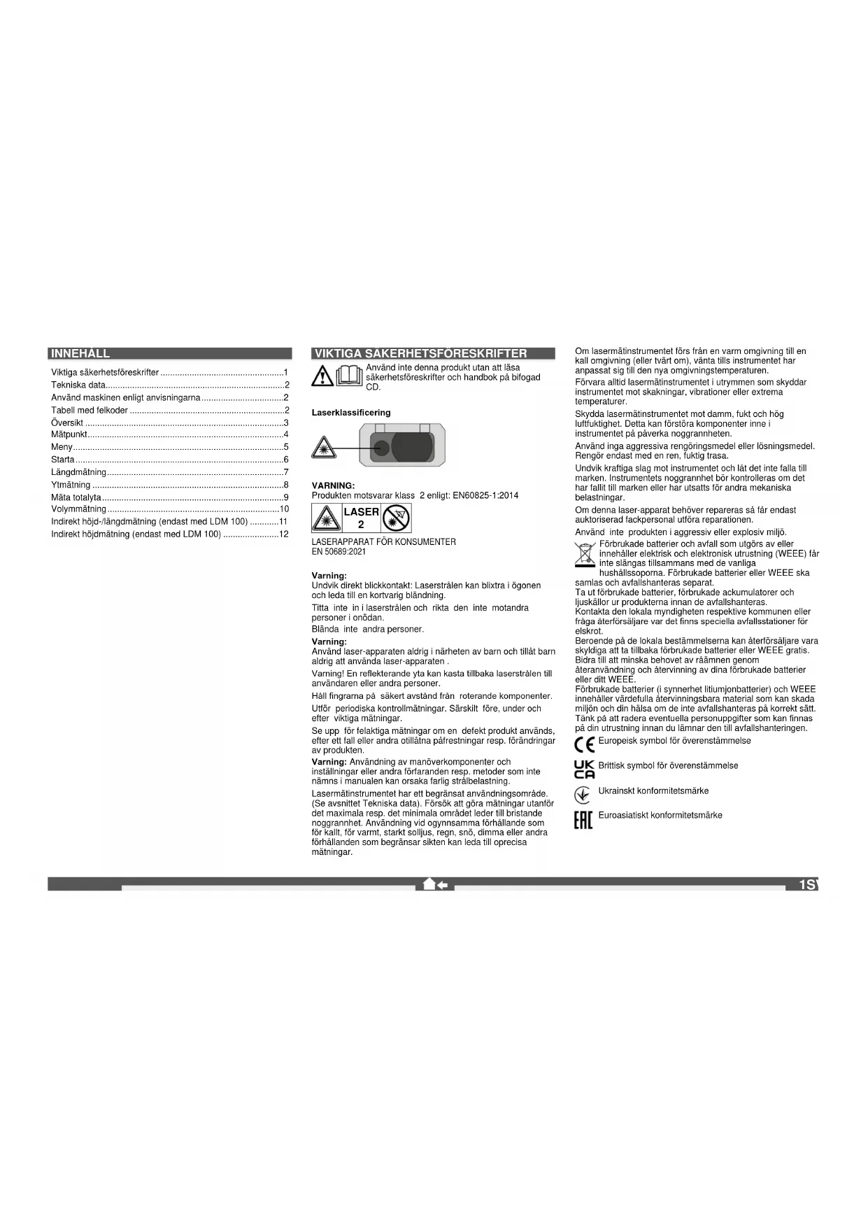 - EN 50689:2021 Varning: Undvik direkt blickkontakt: Laserstrålen kan blixtra i ögonen och leda till en kortvarig bländning. Titta inte in i laserstrålen och rikta den inte motandra personer i onödan. Blända inte andra personer. Varning: Använd laser-apparaten aldrig i närheten av barn och tillåt barn aldrig att använda laser-apparaten . Varning! En reekterande yta kan kasta tillbaka laserstrålen till användaren eller andra personer. Håll ngrarna på säkert avstånd från roterande komponenter. Utför periodiska kontrollmätningar. Särskilt före, under och efter viktiga mätningar. Se upp för felaktiga mätningar om en defekt produkt används, efter ett fall eller andra otillåtna påfrestningar resp. förändringar av produkten. Varning: Användning av manöverkomponenter och inställningar eller andra förfaranden resp. metoder som inte nämns i manualen kan orsaka farlig strålbelastning. Lasermätinstrumentet har ett begränsat användningsområde. (Se avsnittet Tekniska data). Försök att göra mätningar utanför det maximala resp. det minimala området leder till bristande noggrannhet. Användning vid ogynnsamma förhållande som för kallt, för varmt, starkt solljus, regn, snö, dimma eller andra förhållanden som begränsar sikten kan leda till oprecisa mätningar. Om lasermätinstrumentet förs från en varm omgivning till en kall omgivning (eller tvärt om), vänta tills instrumentet har anpassat sig till den nya omgivningstemperaturen. Förvara alltid lasermätinstrumentet i utrymmen som skyddar instrumentet mot skakningar, vibrationer eller extrema temperaturer. Skydda lasermätinstrumentet mot damm, fukt och hög luftfuktighet. Detta kan förstöra komponenter inne i instrumentet på påverka noggrannheten. Använd inga aggressiva rengöringsmedel eller lösningsmedel. Rengör endast med en ren, fuktig trasa. Undvik kraftiga slag mot instrumentet och låt det inte falla till marken. Instrumentets noggrannhet bör kontrolleras om det har fallit till marken eller har utsatts för andra mekaniska belastningar. Om denna laser-apparat behöver repareras så får endast auktoriserad fackpersonal utföra reparationen. Använd inte produkten i aggressiv eller explosiv miljö. Förbrukade batterier och avfall som utgörs av eller innehåller elektrisk och elektronisk utrustning (WEEE) får inte slängas tillsammans med de vanliga hushållssoporna. Förbrukade batterier eller WEEE ska samlas och avfallshanteras separat. Ta ut förbrukade batterier, förbrukade ackumulatorer och ljuskällor ur produkterna innan de avfallshanteras. Kontakta den lokala myndigheten respektive kommunen eller fråga återförsäljare var det nns speciella avfallsstationer för elskrot. Beroende på de lokala bestämmelserna kan återförsäljare vara skyldiga att ta tillbaka förbrukade batterier eller WEEE gratis. Bidra till att minska behovet av råämnen genom återanvändning och återvinning av dina förbrukade batterier eller ditt WEEE. Förbrukade batterier (i synnerhet litiumjonbatterier) och WEEE innehåller värdefulla återvinningsbara material som kan skada miljön och din hälsa om de inte avfallshanteras på korrekt sätt. Tänk på att radera eventuella personuppgifter som kan nnas på din utrustning innan du lämnar den till avfallshanteringen. Europeisk symbol för överenstämmelse Brittisk symbol för överenstämmelse Ukrainskt konformitetsmärke Euroasiatiskt konformitetsmärke INNEHÅLL Viktiga säkerhetsföreskrifter p. 1