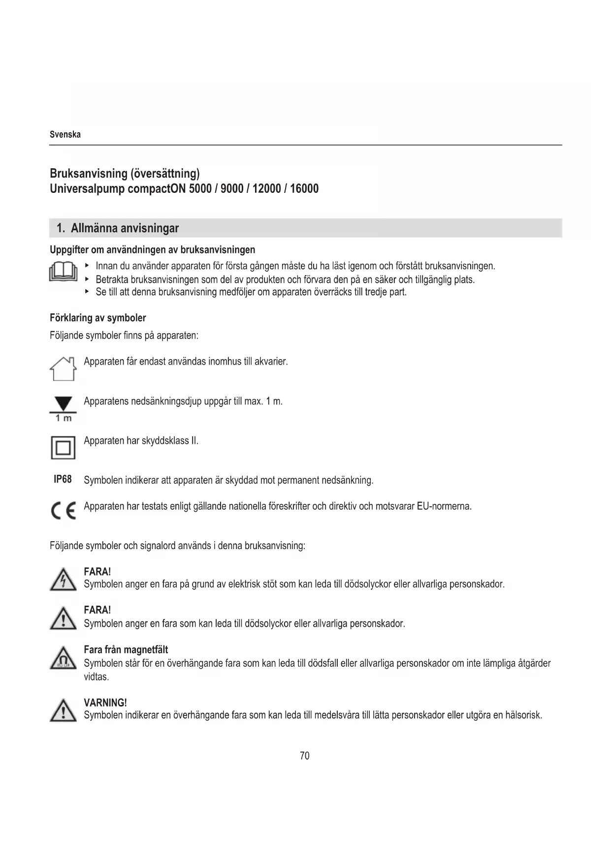 Se side 3.70 Svenska Bruksanvisning (översättning) Universalpump compactON 5000 / 9000 / 12000 / 16000