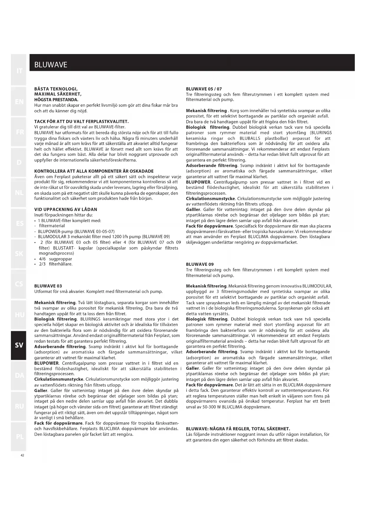 BLUWAVE har utformats for att bereda dig storsta noje och for att till fullo trygga dina fiskars och vaxters liv och halsa. Nagra f minuters underhall varje manad ar allt som kravs for att sakerstalla att akvariet alltid fungarar helt och hallett efectivt. BLUWAVE ar forsett med allt som kravs for att det sha fungera somBST. Alla delar har blivit nogrant utprovade och uppyller de internationla sakerhetsforeskrifterna.