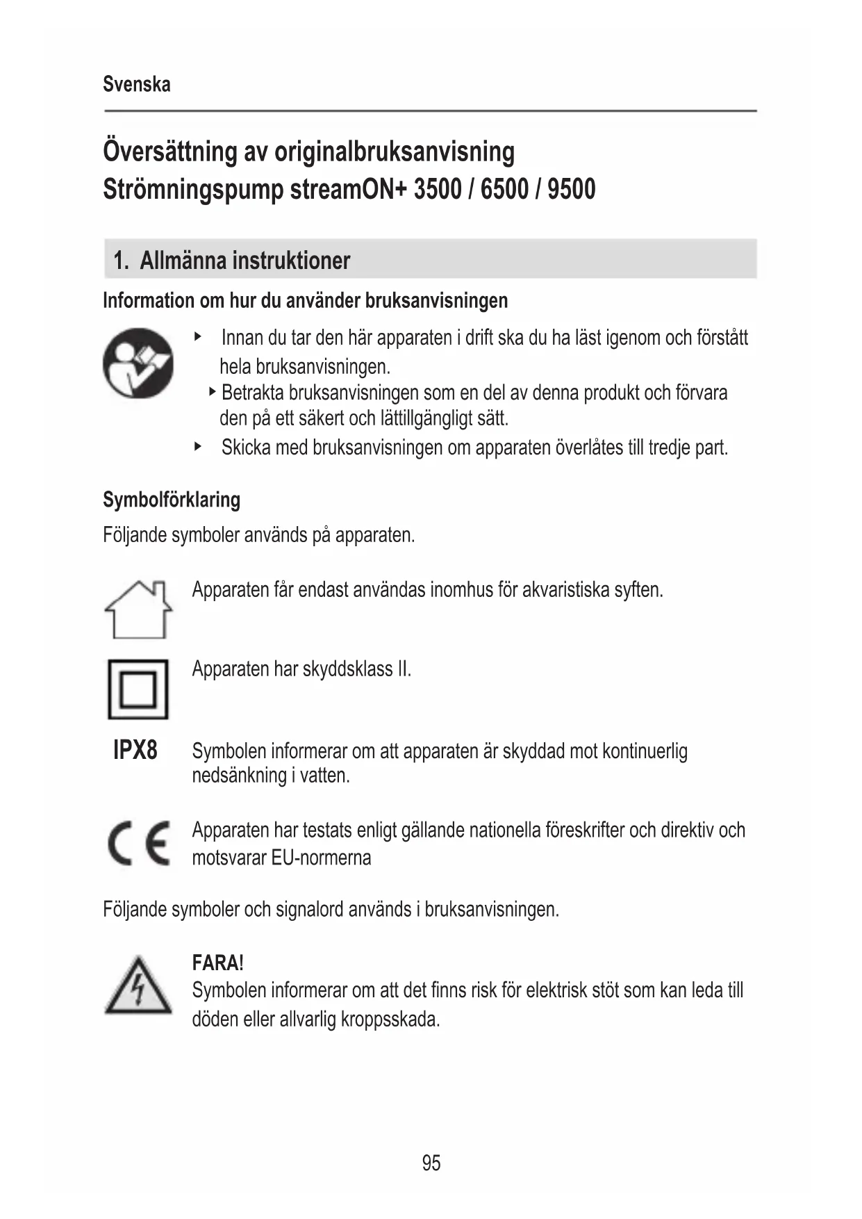 Information om hur du använder bruksanvisningen ▶ Innan du tar den här apparaten i drift ska du ha läst igenom och förstått hela bruksanvisningen. ▶ Betrakta bruksanvisningen som en del av denna produkt och förvara den på ett säkert och lättillgängligt sätt. ▶ Skicka med bruksanvisningen om apparaten överlåtes till tredje part. Symbolförklaring Följande symboler används på apparaten. Apparaten får endast användas inomhus för akvaristiska syften. Apparaten har skyddsklass II. Symbolen informerar om att apparaten är skyddad mot kontinuerlig nedsänkning i vatten. Apparaten har testats enligt gällande nationella föreskrifter och direktiv och motsvarar EU-normerna Följande symboler och signalord används i bruksanvisningen. FARA! Symbolen informerar om att det nns risk för elektrisk stöt som kan leda till döden eller allvarlig kroppsskada. IPX8Svenska