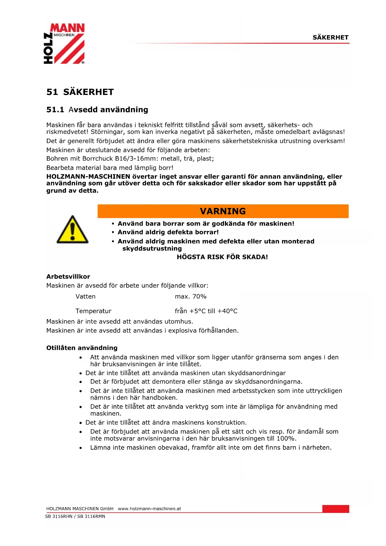 Maskinen får bara användas i tekniskt felfritt tillstånd såväl som avsett, säkerhets- och riskmedvetet! Störningar, som kan inverka negativt på säkerheten, måste omedelbart avlägsnas! Det är generellt förbjudet att ändra eller göra maskinens säkerhetstekniska utrustning overksam! Maskinen är uteslutande avsedd för följande arbeten: Bohren mit Borrchuck B16/3-16mm: metall, trä, plast; Bearbeta material bara med lämplig borr! HOLZMANN-MASCHINEN övertar inget ansvar eller garanti för annan användning, eller användning som går utöver detta och för sakskador eller skador som har uppstått på grund av detta.