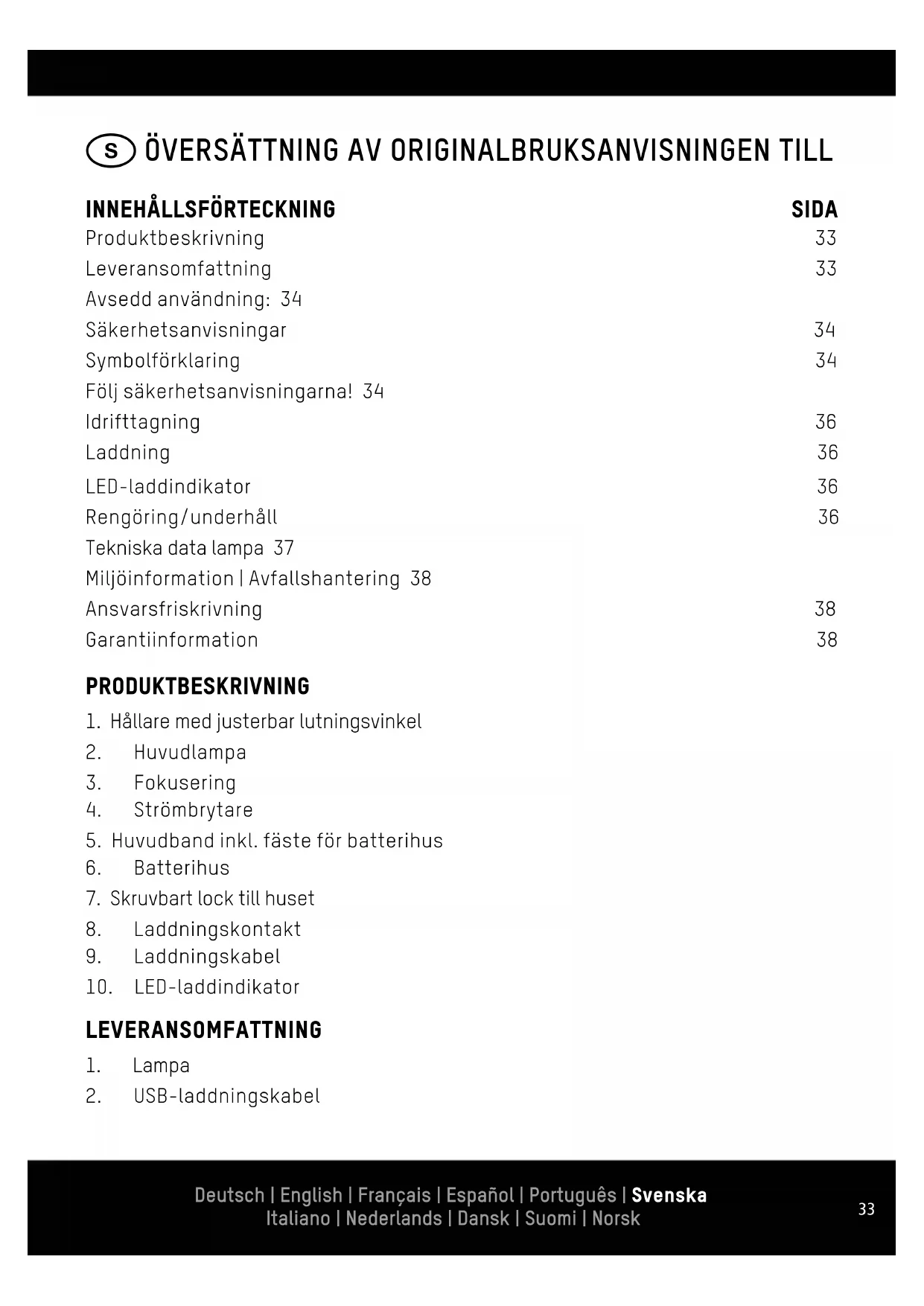 Produktbeskrivning 33 Leveransomfattning 33 Avsedd användning: 34 Säkerhetsanvisningar 34 Symbolförklaring 34 Följ säkerhetsanvisningarna! 34 Idrifttagning 36 Laddning 36 LED-laddindikator 36 Rengöring/underhåll 36 Tekniska data lampa 37 Miljöinformation | Avfallshantering 38 Ansvarsfriskrivning 38 Garantiinformation 38 Deutsch | English | Français | Español | Português | Svenska Italiano | Nederlands | Dansk | Suomi | Norsk Deutsch | English | Français | Español | Português | Svenska Italiano | Nederlands | Dansk | Suomi | Norsk34