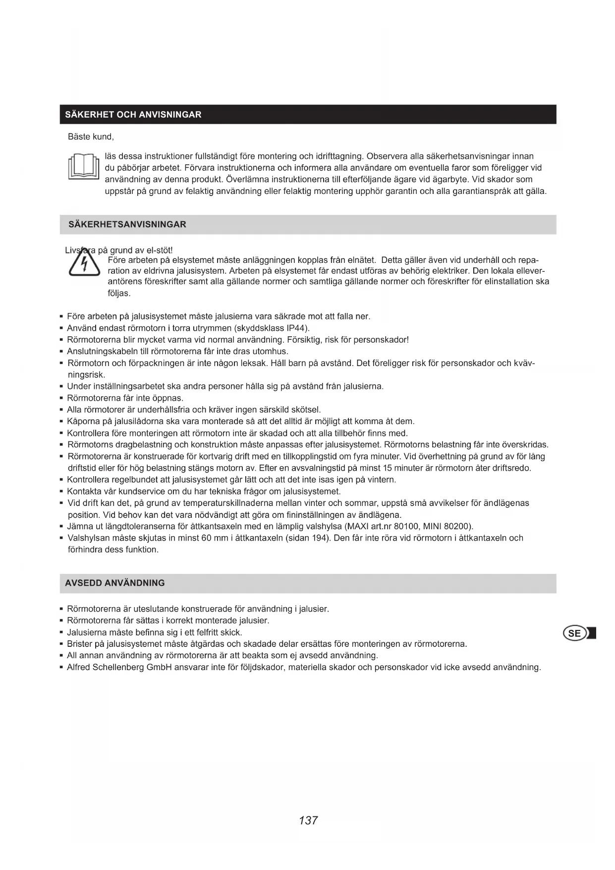 SäKERHET OCH ANVISNINGAR Bäste kund, läs dessa instruktioner fullständigt före montering och idrifttagning. Observera alla säkerhetsanvisningar innan du påbörjar arbetet. Förvara instruktionerna och informera alla användare om eventuella faror som föreligger vid användning av denna produkt. Överlämna instruktionerna till efterföljande ägare vid ägarbyte. Vid skador som uppstår på grund av felaktig användning eller felaktig montering upphör garantin och alla garantianspråk att gälla. SäKERHETSANVISNINGAR Livsfara på grund av el-stöt! Före arbeten på elsystemet måste anläggningen kopplas från elnätet. Detta gäller även vid underhåll och repa- ration av eldrivna jalusisystem. Arbeten på elsystemet får endast utföras av behörig elektriker. Den lokala ellever- antörens föreskrifter samt alla gällande normer och samtliga gällande normer och föreskrifter för elinstallation ska följas. Före arbeten på jalusisystemet måste jalusierna vara säkrade mot att falla ner. Använd endast rörmotorn i torra utrymmen (skyddsklass IP44). Rörmotorerna blir mycket varma vid normal användning. Försiktig, risk för personskador! Anslutningskabeln till rörmotorerna får inte dras utomhus. Rörmotorn och förpackningen är inte någon leksak. Håll barn på avstånd. Det föreligger risk för personskador och kväv- ningsrisk. Under inställningsarbetet ska andra personer hålla sig på avstånd från jalusierna. Rörmotorerna får inte öppnas. Alla rörmotorer är underhållsfria och kräver ingen särskild skötsel. Kåporna på jalusilådorna ska vara monterade så att det alltid är möjligt att komma åt dem. Kontrollera före monteringen att rörmotorn inte är skadad och att alla tillbehör nns med. Rörmotorns dragbelastning och konstruktion måste anpassas efter jalusisystemet. Rörmotorns belastning får inte överskridas. Rörmotorerna är konstruerade för kortvarig drift med en tillkopplingstid om fyra minuter. Vid överhettning på grund av för lång driftstid eller för hög belastning stängs motorn av. Efter en avsvalningstid på minst 15 minuter är rörmotorn åter driftsredo. Kontrollera regelbundet att jalusisystemet går lätt och att det inte isas igen på vintern. Kontakta vår kundservice om du har tekniska frågor om jalusisystemet. Vid drift kan det, på grund av temperaturskillnaderna mellan vinter och sommar, uppstå små avvikelser för ändlägenas position. Vid behov kan det vara nödvändigt att göra om ninställningen av ändlägena. Jämna ut längdtoleranserna för åttkantsaxeln med en lämplig valshylsa (MAXI art.nr 80100, MINI 80200). Valshylsan måste skjutas in minst 60 mm i åttkantaxeln (sidan 194). Den får inte röra vid rörmotorn i åttkantaxeln och förhindra dess funktion. AVSEDD ANVäNDNING Rörmotorerna är uteslutande konstruerade för användning i jalusier. Rörmotorerna får sättas i korrekt monterade jalusier. Jalusierna måste benna sig i ett felfritt skick. Brister på jalusisystemet måste åtgärdas och skadade delar ersättas före monteringen av rörmotorerna. All annan användning av rörmotorerna är att beakta som ej avsedd användning. Alfred Schellenberg GmbH ansvarar inte för följdskador, materiella skador och personskador vid icke avsedd användning.138