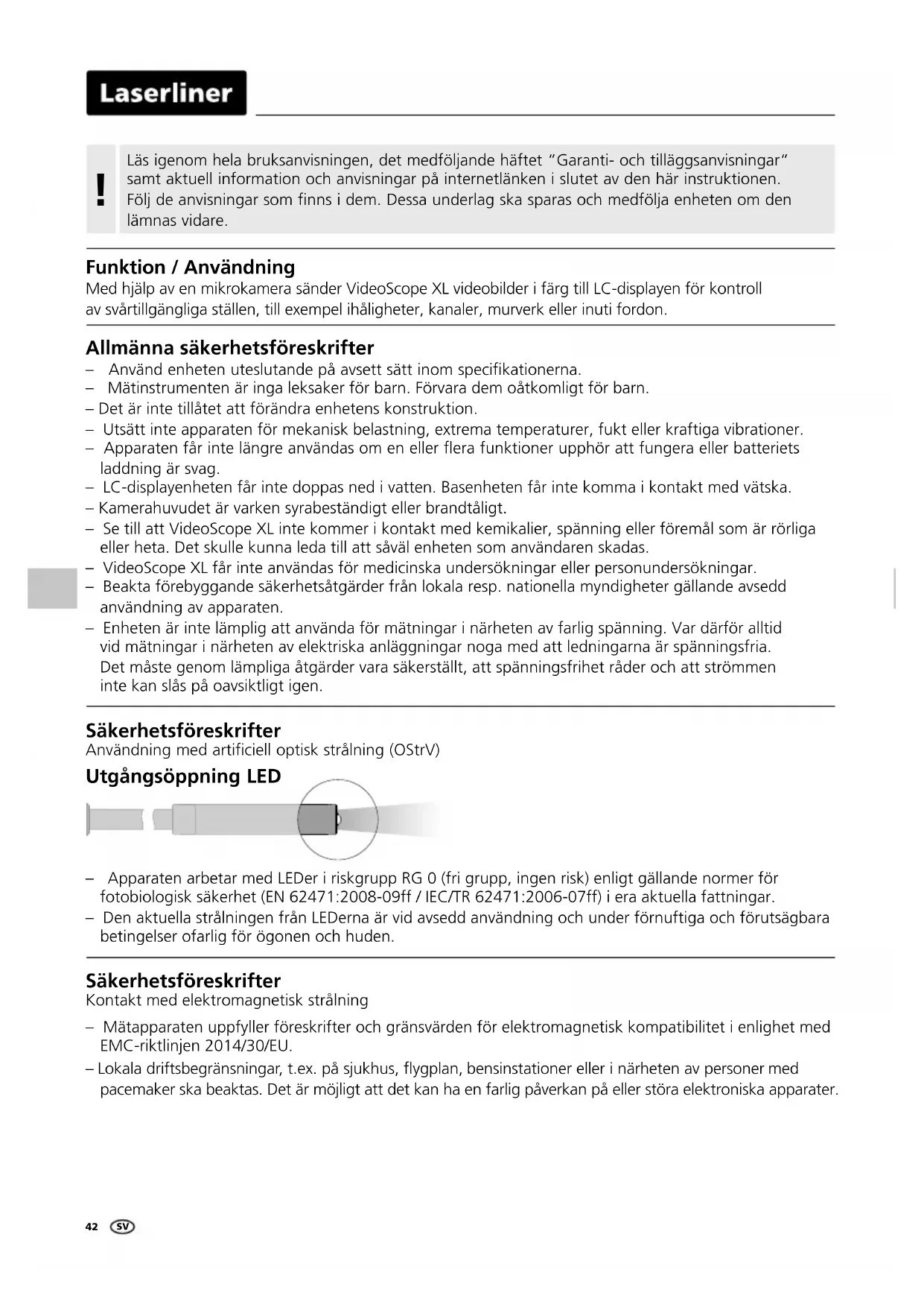 Allmänna säkerhetsföreskrifter – Använd enheten uteslutande på avsett sätt inom specikationerna. – Mätinstrumenten är inga leksaker för barn. Förvara dem oåtkomligt för barn. – Det är inte tillåtet att förändra enhetens konstruktion. – Utsätt inte apparaten för mekanisk belastning, extrema temperaturer, fukt eller kraftiga vibrationer. – Apparaten får inte längre användas om en eller era funktioner upphör att fungera eller batteriets laddning är svag. – LC-displayenheten får inte doppas ned i vatten. Basenheten får inte komma i kontakt med vätska. – Kamerahuvudet är varken syrabeständigt eller brandtåligt. – Se till att VideoScope XL inte kommer i kontakt med kemikalier, spänning eller föremål som är rörliga eller heta. Det skulle kunna leda till att såväl enheten som användaren skadas. – VideoScope XL får inte användas för medicinska undersökningar eller personundersökningar. – Beakta förebyggande säkerhetsåtgärder från lokala resp. nationella myndigheter gällande avsedd användning av apparaten. – Enheten är inte lämplig att använda för mätningar i närheten av farlig spänning. Var därför alltid vid mätningar i närheten av elektriska anläggningar noga med att ledningarna är spänningsfria. Det måste genom lämpliga åtgärder vara säkerställt, att spänningsfrihet råder och att strömmen inte kan slås på oavsiktligt igen. – Apparaten arbetar med LEDer i riskgrupp RG 0 (fri grupp, ingen risk) enligt gällande normer för fotobiologisk säkerhet (EN 62471:2008-09ff / IEC/TR 62471:2006-07ff) i era aktuella fattningar. – Den aktuella strålningen från LEDerna är vid avsedd användning och under förnuftiga och förutsägbara betingelser ofarlig för ögonen och huden. Säkerhetsföreskrifter Kontakt med elektromagnetisk strålning – Mätapparaten uppfyller föreskrifter och gränsvärden för elektromagnetisk kompatibilitet i enlighet med EMC-riktlinjen 2014/30/EU. – Lokala driftsbegränsningar, t.ex. på sjukhus, ygplan, bensinstationer eller i närheten av personer med pacemaker ska beaktas. Det är möjligt att det kan ha en farlig påverkan på eller störa elektroniska apparater. Säkerhetsföreskrifter Användning med artificiell optisk strålning (OStrV) Utgångsöppning LED