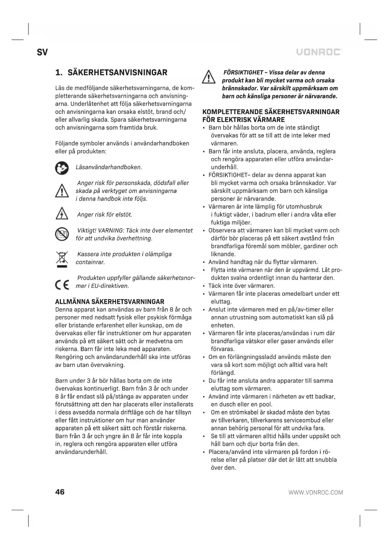 gallret (3) är blockerat Håll värmaren långt från föremål som gardin, plastpåse, papper och andra saker som kan täcka intaget eller kan hindra luftintaget Problem Möjlig orsak Lösning Apparaten värms inte upp, bara fläkten fungerar Omkopplaren har inte ställts in på värmein- ställningen Vrid omkopplaren till värmein- ställning Termostaten aktiverades Vrid termostaten och lyssna om det finns öppen/stäng-signal. Om det inte hörs något klick och termostaten inte är skadad, slås värmaren på automatiskt när apparaten svalnat Den auto- matiska avstängningen fungerade Stäng av värmaren och inspek- tera blockering av inlopp eller utlopp. Koppla ur kontakten och vänta minst 10 minuter tills skyddssystemet återställs innan du försöker starta om värmaren. Onormalt ljud Apparaten står inte upp Ställ värmaren på en plan yta MILJÖ Felaktig och/eller kasserad elektrisk eller elektronisk utrustning måste lämnas in på lämpliga återvinningsstationer. Endast för EU-länder Kassera inte elverktyg ihushållsavfall. Enligt den europeiska riktlinjen 2012/19/EU om kasserad elektrisk och elektronisk utrustning och dess tillämpning inationell rätt måste elverktyg som inte längre är användbara samlas in separat och kasseras på ett miljövänligt sätt. GARANTI VONROC-produkter är utvecklade enligt högsta kvalitetsstandard och garanteras fria från defekter ibåde material och utförande under den period som lagen föreskriver från och med inköpsdatumet. Om produkten skulle utveckla fel under denna peri- od på grund av defekt material och/eller utförande, kontakta då VONROC direkt. Följande omständigheter är undantagna från denna garanti: