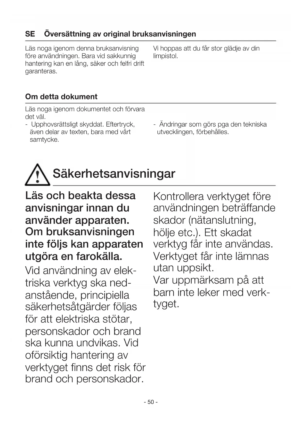 Ta hänsyn till hur omgivningen kan påverkas. Elektriska verktyg får inte utsättas för regn. De får inte användas i fuktigt tillstånd eller i blöt och fuktig omgivning. Var försiktig vid använd- ningen av verktyget i närheten av brännbara material. Rikta det ald- rig mot ett och samma ställe under en längre tid. Använd det aldrig i explo- sionsfarlig miljö. Värme kan ledas till brännbara material som är dolda. Skydda dig mot elektriska stötar. Undvik kroppskontakt med jordade delar som t.ex. rör, värmeelement, spisar, kylskåp. Lämna inte verktyget utan uppsikt så länge det är igång. Förvara dina verktyg säkert. Låt verktyget svalna efter användningen innan du packar ner det igen. Verktyg som inte används ska förvaras i ett torrt och låst utrymme, oåtkomligt för barn. Detta verktyg kan använ- das av barn från 8 år och äldre samt av personer med nedsatt fysisk, sens- orisk eller mental förmåga eller bristande erfarenhet och kunskap, i närvaro av en handledare eller efter att de instruerats om verktygets säkra använd- ning och förstår vilka ris- ker som kan uppstå. Barn får inte leka med verktyget. Rengöring och underhåll får inte utföras av barn utan uppsyn. Säkerhetsanvisningar- 52 - Överbelasta inte dina verktyg. Du arbetar bättre och säkrare inom det angivna effektområdet. Bär inte verktyget i kabeln och dra inte stickkontakten ur uttaget med verktyget. Skydda kabeln mot vär- me, olja och vassa kanter. Se upp med giftiga gaser och antänd- ningsrisken. Vid bearbetning av plast- material, lacker och lik- nande material kan giftiga gaser frigöras. Det finns risk för brand och antändning. Använd för din egen sä- kerhet endast tillbehör och extra utrust- ning som anges i bruks- anvisningen eller som rekommenderas av verk- tygstillverkaren. Användningen av andra verktyg och tillbehör än de som rekommenderas i bruksanvisningen eller i katalogen, kan leda till personskador. Reparationer får bara göras av en elfackman. Detta elverktyg motsvarar tillämpliga säkerhetsbe- stämmelser. Reparationer får bara utföras av en be- hörig elfackman, annars finns risk för olyckor. Om verktygets nätanslutning skadas måste den by- tas ut av tillverkaren eller dess kundtjänst eller av en annan kvalificerad per- son för att undvika risker. Förvara dessa säker- hetsanvisningar vid verktyget. Säkerhetsanvisningar- 53 -