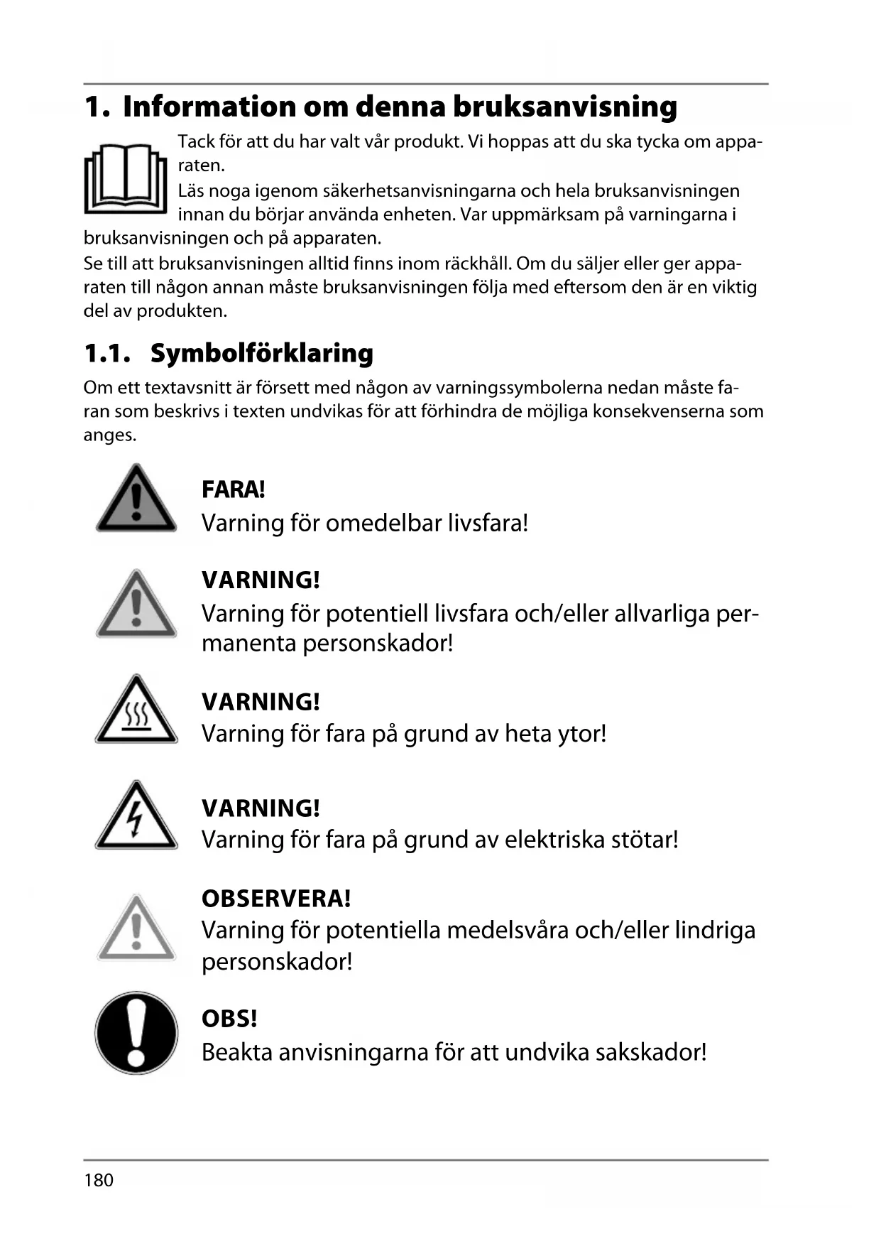 Tack för att du har valt vår produkt. Vi hoppas att du ska tycka om appa- raten. Läs noga igenom säkerhetsanvisningarna och hela bruksanvisningen innan du börjar använda enheten. Var uppmärksam på varningarna i bruksanvisningen och på apparaten. Se till att bruksanvisningen alltid finns inom räckhåll. Om du säljer eller ger appa- raten till någon annan måste bruksanvisningen följa med eftersom den är en viktig del av produkten. 1.1. Symbolförklaring Om ett textavsnitt är försett med någon av varningssymbolerna nedan måste fa- ran som beskrivs i texten undvikas för att förhindra de möjliga konsekvenserna som anges. FARA! Varning för omedelbar livsfara! VARNING! Varning för potentiell livsfara och/eller allvarliga per- manenta personskador! VARNING! Varning för fara på grund av heta ytor! VARNING! Varning för fara på grund av elektriska stötar! OBSERVERA! Varning för potentiella medelsvåra och/eller lindriga personskador! OBS! Beakta anvisningarna för att undvika sakskador! 18490 ML-Int.Sales Content 5006 8296 Final rev1.indb 18018490 ML-Int.Sales Content 5006 8296 Final rev1.indb 180 08.10.2021 12:23:5908.10.2021 12:23:59181