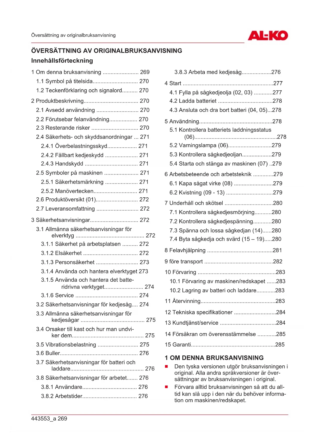 För frågor om garanti, reparationer och reservde- lar, kontakta närmaste AL-KO servicecenter. Kontaktinformation finns på internet: www.alko-garden.com/service-contacts Du hittar mer reservdelsinformation på: www.alko-garden.com/spareparts443553_a 285 Försäkran om överensstämmelse