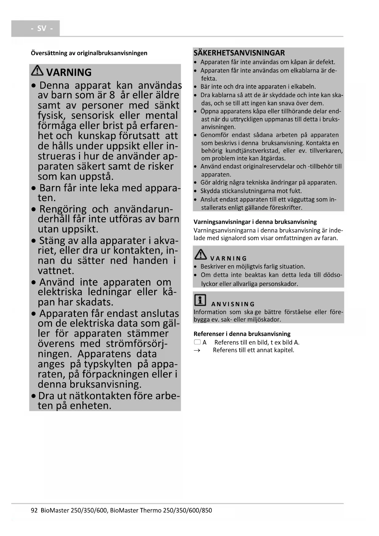 - Genomför endast sådana arbeten på apparaten som beskrivs i denna bruksanvisning. Kontakta en behörig kundtjänstverkstad, eller ev. tillverkaren, om problem inte kan åtgärdas.