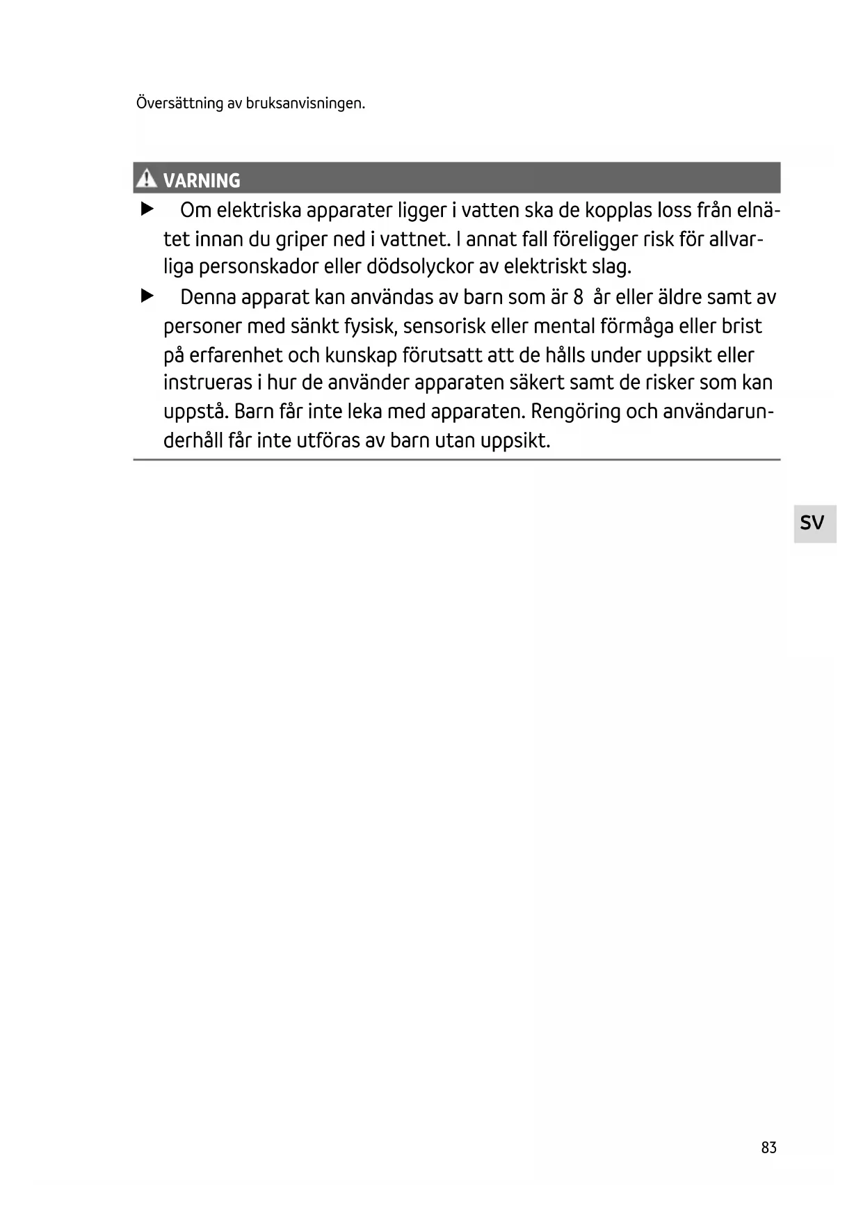VARNING VARNING Om elektriska apparater ligger i vatten ska de kopplas loss från elnä- tet innan du griper ned i vattnet. I annat fall föreligger risk för allvar- liga personskador eller dödsolyckor av elektriskt slag. Denna apparat kan användas av barn som är 8 år eller äldre samt av personer med sänkt fysisk, sensorisk eller mental förmåga eller brist på erfarenhet och kunskap förutsatt att de hålls under uppsikt eller instrueras i hur de använder apparaten säkert samt de risker som kan uppstå. Barn får inte leka med apparaten. Rengöring och användarun- derhåll får inte utföras av barn utan uppsikt.84 Säkerhetsanvisningar Elanslutning Apparaten får endast anslutas om de elektriska data som gäller för apparaten stämmer över- ens med strömförsörjningen. Anslut endast apparaten till ett vägguttag som installerats enligt gällande föreskrifter. Appa- raten måste vara ansluten till en jordfelsbrytare vars dimensionerade felström uppgår till max. 30 mA. Förlängningskablar och strömfördelare (t ex grenuttag) ska vara godkända för användning ut- omhus (dropptäta). Skydda öppna kontakter och uttag mot fukt. Säker drift Använd inte apparaten om personer befinner sig i vattnet. Använd inte apparaten om elektriska ledningar eller kåpor har skadats. En skadad strömkabel ska genast bytas av OASE, en behörig kundtjänstverkstad eller en behö- rig elinstallatör för att undvika risk för strömstöt. Bär inte och dra inte apparaten i elkabeln. Dra kablarna så att de är skyddade motskador och att ingen kan snava över dem. Genomför aldrig tekniska ändringar på apparaten. Genomför endast sådana arbeten på apparaten som beskrivs i denna anvisning. Använd endast originalreservdelar och -tillbehör. Kontakta behörig kundtjänst eller OASE om problem uppstår. Ändamålsenlig användning Använd produkten som beskrivs i den här handboken endast på följande sätt: Pumpning av klart vatten eller regnvatten. Pumpning av klorerat vatten. Pumpning av smutsvatten med partiklar under 40 mm. Påfyllning och bevattning. Om- och utpumpning av behållare eller bassänger. Vattenuttag från regnvattentunnor eller cisterner. Med hänsyn till tekniska data. (→ Tekniska data) För apparaten gäller följande begränsningar: Inte lämplig för saltvatten. Inte lämplig för dricksvatten. Får inte användas i långtidsdrift (t ex för kontinuerlig cirkulation i dammar). Får inte användas för industriella ändamål. Använd inte kombination med kemikalier, livsmedel eller lättantändliga eller explosiva ämnen. Får inte anslutas till dricksvattennätet.SV