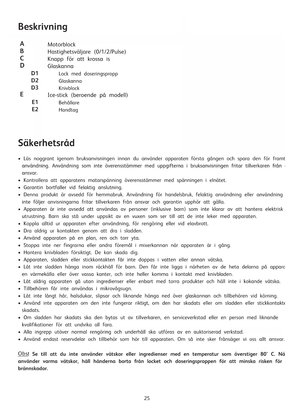 - Använd endast reservdelar och tillbehör som hör till apparaten. Om så inte sker frånsäger vi oss allt ansvar. Obs ! Se till att du inte använder vätskor eller ingredienser med en temperatur som överstiger 80° C. När du använder varma vätskor, håll händerna borta från locket och doseringsproppen för att minska risken för brännskador.26 Första användning