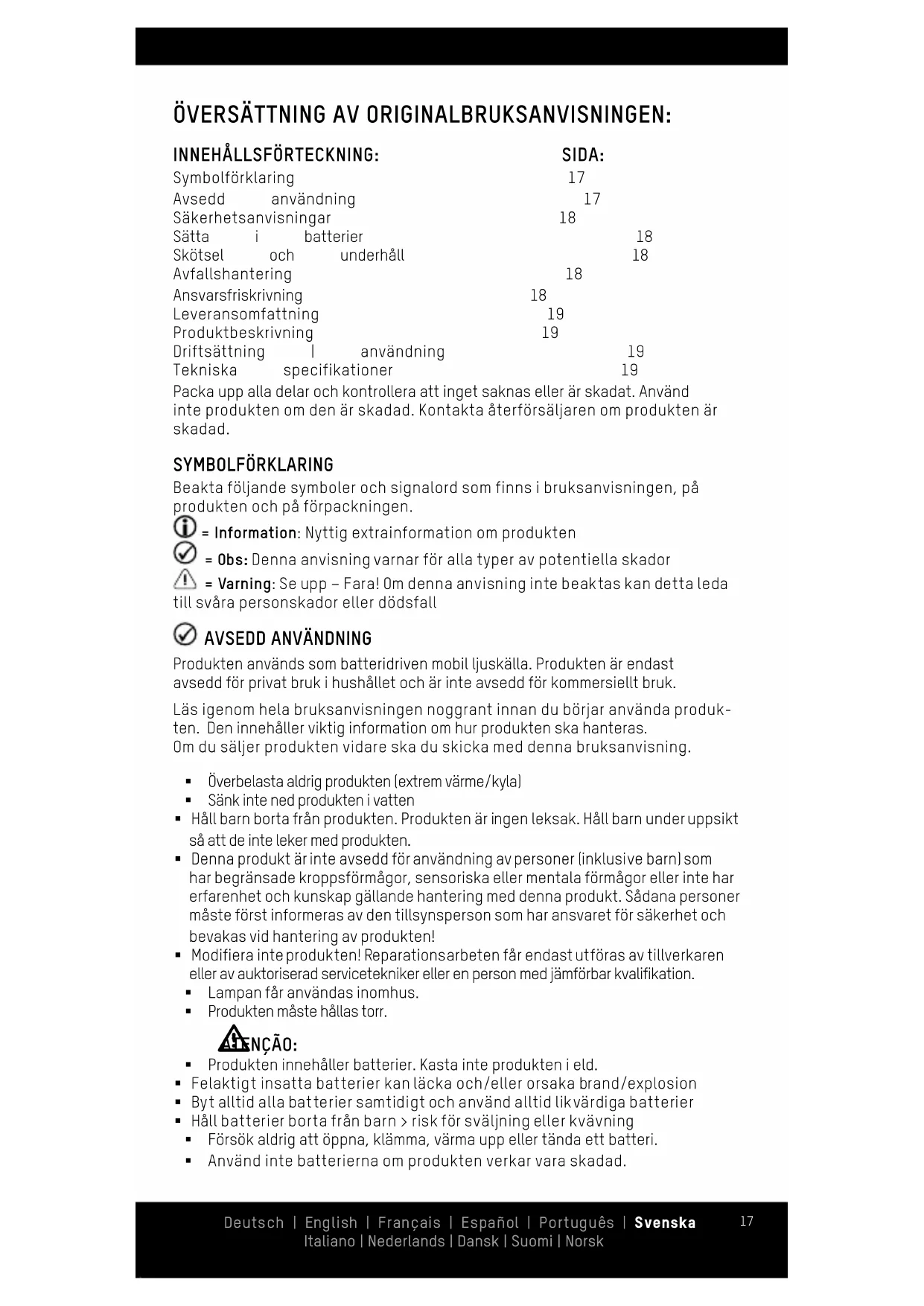 ATENÇÃO: § Produkten innehåller batterier. Kasta inte produkten i eld. § Felaktigt insatta batterier kan läcka och/eller orsaka brand/explosion § Byt alltid alla batterier samtidigt och använd alltid likvärdiga batterier § Håll batterier borta från barn > risk för sväljning eller kvävning § Försök aldrig att öppna, klämma, värma upp eller tända ett batteri. § Använd inte batterierna om produkten verkar vara skadad. Deutsch | English | Français | Español | Português | Svenska Italiano | Nederlands | Dansk | Suomi | Norsk18 § Batterierna kan inte laddas! § Avfallshantera använda batterier/uppladdningsbara batterier enligt lokala lagar eller krav. § Om batterier läcker ska de inte vidröras. Om du kommer i kontakt med batteri- vätska ska du genast tvätta det berörda stället noggrant med vatten. § Om batterivätskan orsakar hudreaktion eller hamnar i ögonen ska läkare omedelbart kontaktas. § Kortslut inte batterierna! § Gamla eller tomma batterier ska genast tas ut ur lampan § Om lampan inte ska användas längre måste du ta bort batterierna ur lampan innan du avfallshanterar den SÄKERHETSANVISNINGAR