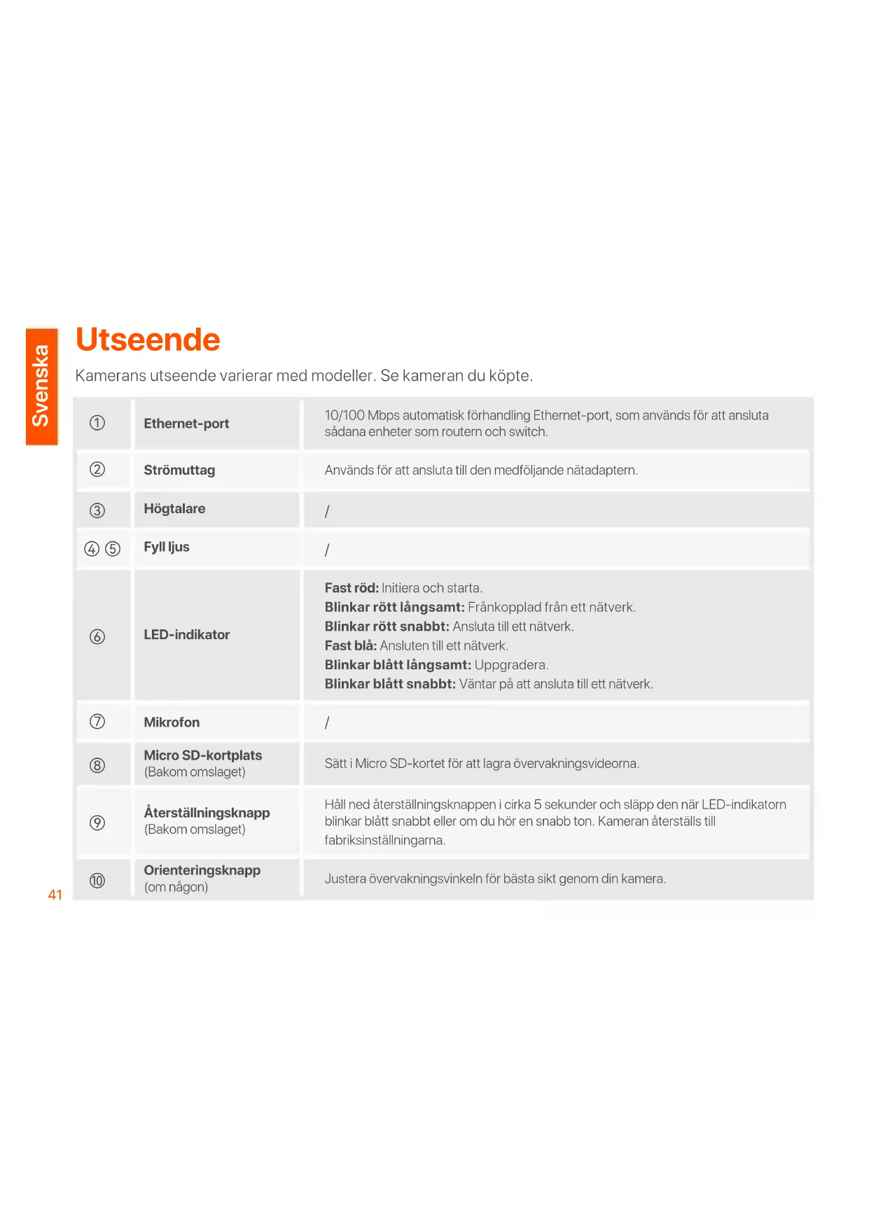 Används för att ansluta till den medföljande nätadaptern. 10/100 Mbps automatisk förhandling Ethernet-port, som används för att ansluta sådana enheter som routern och switch. Fast röd: Initiera och starta. Blinkar rött långsamt: Frånkopplad från ett nätverk. Blinkar rött snabbt: Ansluta till ett nätverk. Fast blå: Ansluten till ett nätverk. Blinkar blått långsamt: Uppgradera. Blinkar blått snabbt: Väntar på att ansluta till ett nätverk. Sätt i Micro SD-kortet för att lagra övervakningsvideorna. Håll ned återställningsknappen i cirka 5 sekunder och släpp den när LED-indikatorn blinkar blått snabbt eller om du hör en snabb ton. Kameran återställs till fabriksinställningarna. Justera övervakningsvinkeln för bästa sikt genom din kamera. Fyll ljus LED-indikator Mikrofon Högtalare