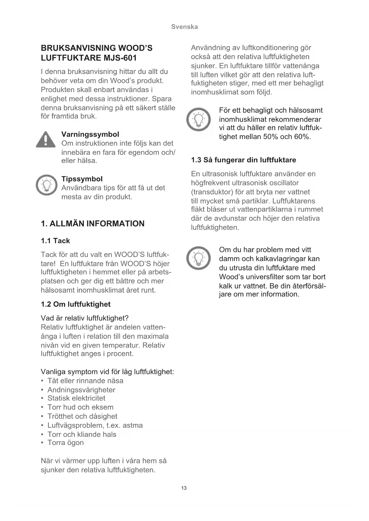 LUFTFUKTARE MJS-601 I denna bruksanvisning hittar du allt du behöver veta om din Wood’s produkt. Produkten skall enbart användas i enlighet med dessa instruktioner. Spara denna bruksanvisning på ett säkert ställe för framtida bruk. Varningssymbol Om instruktionen inte följs kan det innebära en fara för egendom och/ eller hälsa. Tipssymbol Användbara tips för att få ut det mesta av din produkt.