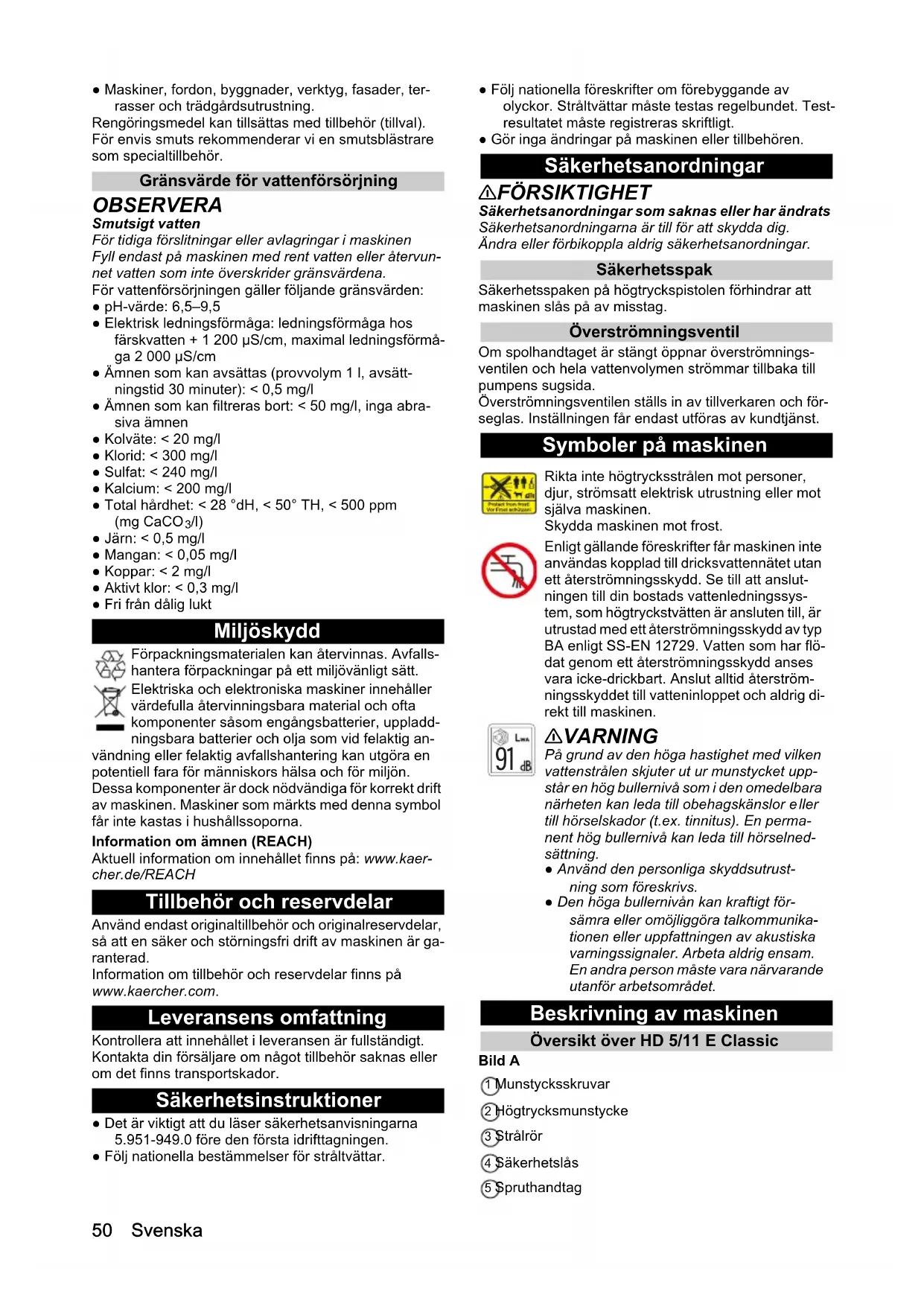 /l) ● Järn: < 0,5 mg/l ● Mangan: < 0,05 mg/l ● Koppar: < 2 mg/l ● Aktivt klor: < 0,3 mg/l ● Fri från dålig lukt Miljöskydd Förpackningsmaterialen kan återvinnas. Avfalls- hantera förpackningar på ett miljövänligt sätt. Elektriska och elektroniska maskiner innehåller värdefulla återvinningsbara material och ofta komponenter såsom engångsbatterier, uppladd- ningsbara batterier och olja som vid felaktig an- vändning eller felaktig avfallshantering kan utgöra en potentiell fara f ör människors hälsa och för miljön. Dessa komponenter är dock nödvändiga för korrekt drift av maskinen. Maskiner som märkts med denna symbol får inte kastas i hushållssoporna. Information om ämnen (REACH) Aktuell information om innehållet finns på: www.kaer- cher.de/REACH Tillbehör och reservdelar Använd endast originaltillbehör och originalreservdelar, så att en säker och störningsfri drift av maskinen är ga- ranterad. Information om tillbehör och reservdelar finns på www.kaercher.com. Leveransens omfattning Kontrollera att innehållet i leveransen är fullständigt. Kontakta din försäljare om något tillbehör saknas eller om det finns transportskador. Säkerhetsinstruktioner ● Det är viktigt att du läser säkerhetsanvisningarna 5.951-949.0 före den första idrifttagningen. ● Följ nationella bestämmelser för stråltvättar. ● Följ nationella föreskrifter om förebyggande av olyckor. Stråltvättar måste testas regelbundet. Test- resultatet måste registreras skriftligt. ● Gör inga ändringar på maskinen eller tillbehören. Säkerhetsanordningar 몇 FÖRSIKTIGHET Säkerhetsanordningar som saknas eller har ändrats Säkerhetsanordningarna är till för att skydda dig. Ändra eller förbikoppla aldrig säkerhetsanordningar. Säkerhetsspak Säkerhetsspaken på högtryckspistolen förhindrar att maskinen slås på av misstag. Överströmningsventil Om spolhandtaget är stängt öppnar överströmnings- ventilen och hela vattenvolymen strömmar tillbaka till pumpens sugsida. Överströmningsventilen ställs in av tillverkaren och för- seglas. Inställningen får endast utföras av kundtjänst. Symboler på maskinen Beskrivning av maskinen Översikt över HD 5/11 E Classic Bild A 1 Munstycksskruvar2 Högtrycksmunstycke3 Strålrör4 Säkerhetslås5 Spruthandtag Rikta inte högtrycksstrålen mot personer, djur, strömsatt elektrisk utrustning eller mot själva maskinen. Skydda maskinen mot frost. Enligt gällande föreskrifter får maskinen inte användas kopplad till dricksvattennätet utan ett återströmningsskydd. Se till att anslut- ningen till din bostads vattenledningssys- tem, som högtryckstvätten är ansluten till, är utrustad med ett återströmningsskydd av typ BA enligt SS-EN 12729. Vatten som har flö- dat genom ett återströmningsskydd anses vara icke-drickbart. Anslut alltid återström- ningsskyddet till vatteninloppet och aldrig di- rekt till maskinen. 몇 VARNING På grund av den höga hastighet med vilken vattenstrålen skjuter ut ur munstycket upp- står en hög bullernivå som i den omedelbara närheten kan leda till obehagskänslor e ller till hörselskador (t.ex. tinnitus). En perma- nent hög bullernivå kan leda till hörselned- sättning. ● Använd den personliga skyddsutrust- ning som föreskrivs. ● Den höga bullernivån kan kraftigt för- sämra eller omöjliggöra talkommunika- tionen eller uppfattningen av akustiska varningssignaler. Arbeta aldrig ensam. En andra person måste vara närvarande utanför arbetsområdet. Svenska 51 6 Avtryckare 7 Högtrycksslang 8 Sprutkrok 9 Extra handtag 10 Kabelkrok 11 Vattenfilter 12 Koger för förvaring av strålrör (för långt strålrör) 13 Vatteninloppsanslutning 14 Vattenutlopp 15 Strömbrytare 16 Handtag, upptill (utdraget) Översikt över HD 5/11 EX Plus Classic Bild B 1 Munstycksskruvar 2 Högtrycksmunstycke 3 Strålrör 4 Säkerhetslås 5 Spruthandtag 6 Avtryckare 7 Högtrycksslang 8 Handtag, upptill (utdraget) 9 Extra handtag 10 Kabelkrok 11 Vattenfilter 12 Koger för förvaring av strålrör (för långt strålrör) 13 Vatteninloppsanslutning 14 Vattenutlopp 15 Strömbrytare 16 Handvev 17 Strålrörshållare 18 Smutsbläster Första start FARA Risk för personskador på grund av elstötar Låt endast behörig yrkespersonal installera vattenför- sörjning, elanslutningar och högtrycksnätet. Färgkodning ● Kontrollelement för rengöringsprocessen är gula. Packa upp