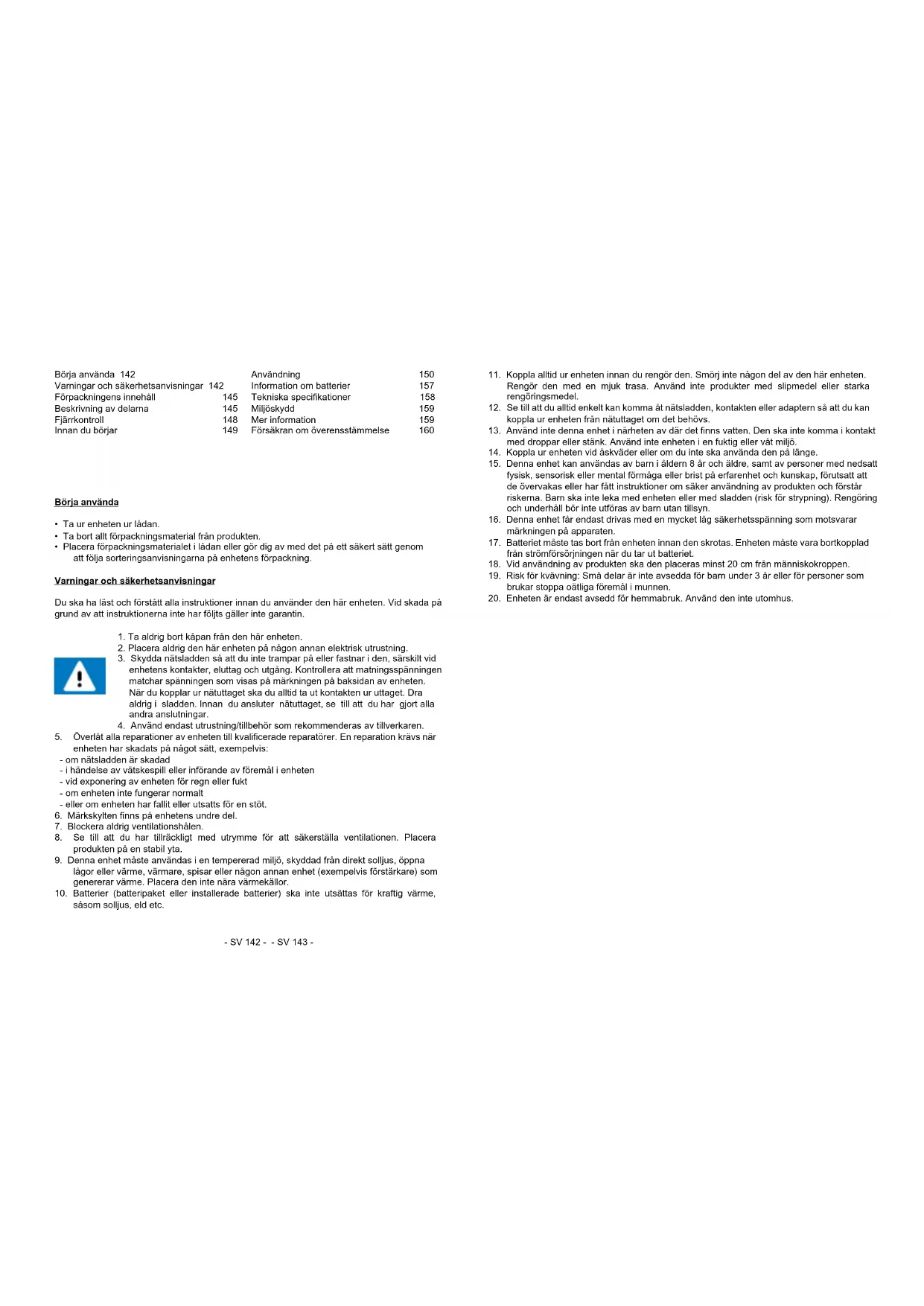 20. Enheten är endast avsedd för hemmabruk. Använd den inte utomhus.