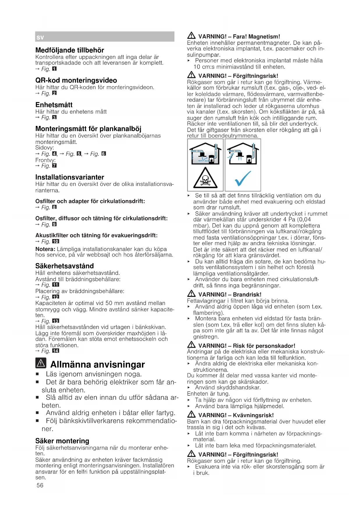 Allmänna anvisningar ¡ Läs igenom anvisningen noga. ¡ Det är bara behörig elektriker som får an- sluta enheten. ¡ Slå alltid av elen innan du utför sådana ar- beten. ¡ Använd aldrig enheten i båtar eller fartyg. ¡ Följ bänkskivtillverkarens rekommendatio- ner. Säker montering Följ säkerhetsanvisningarna när du monterar enhe- ten. Säker användning av enheten kräver fackmässig montering enligt monteringsanvisningen. Installatören ansvarar för en felfri funktion på uppställningsplat- sen. VARNING!‒Fara! Magnetism! Enheten innehåller permanentmagneter. De kan på- verka elektroniska implantat, t.ex. pacemaker och in- sulinpumpar. ▶ Personer med elektroniska implantat måste hålla 10cm:s minimiavstånd till enheten. VARNING!‒Förgiftningsrisk! Rökgaser som går i retur kan ge förgiftning. Värme- källor som förbrukar rumsluft (t.ex. gas-, olje-, ved- el- ler koleldade värmare, flödesvärmare, varmvattenbe- redare) tar förbränningsluft från utrymmet där enhe- ten är installerad och leder ut rökgaserna utomhus via kanaler (t.ex. skorsten). Om köksfläkten är på, så suger den rumsluft från kök och intilliggande rum. Räcker inte ventilationen till, så blir det undertryck. Det får giftgaser från skorsten eller rökgång att gå i retur till boendeutrymmena. ▶ Se till så att det finns tillräcklig ventilation om du använder både enhet med evakuering och eldstad som drar rumsluft. ▶ Säker användning kräver att undertrycket i rummet där värmekällan står underskrider 4 Pa (0,04 mbar). Det kan du uppnå genom att komplettera tilluftflödet till förbränningen via luftkanal/rökgång med fasta ventilationsöppningar t.ex. i dörrar, föns- ter eller med hjälp av andra tekniska lösningar. Det är inte säkert att det räcker med en luftkanal/ rökgång för att klara gränsvärdet. ▶ Du kan alltid fråga din sotare, de kan bedöma hu- sets ventilationssystem i sin helhet och föreslå lämpliga ventilationsåtgärder. ▶ Använder du bara enheten med cirkulationsluft- drift, så finns inga begränsningar. VARNING!‒Brandrisk! Fettavlagringar i filtret kan börja brinna. ▶ Använd aldrig öppen låga vid enheten (som t.ex. flambering). ▶ Montera bara enheten vid eldstad för fasta brän- slen (som t.ex. trä eller kol) om det finns sluten kå- pa som inte går att ta av. Det får inte finnas något gnistregn. VARNING!‒Risk för personskador! Ändringar på de elektriska eller mekaniska konstruk- tionerna är farliga och kan leda till felfunktion. ▶ Ändra aldrig de elektriska eller mekaniska kon- struktionerna. Du kommer åt delar med vassa kanter vid monte- ringen som kan ge skärskador. ▶ Använd skyddshandskar. Enheten är tung. ▶ Ta hjälp av någon vid förflyttning av enheten. ▶ Använd bara lämpliga hjälpmedel. VARNING!‒Kvävningsrisk! Barn kan dra förpackningsmaterial över huvudet eller trassla in sig i det och kvävas. ▶ Låt inte barn komma i närheten av förpacknings- material. ▶ Låt inte barn leka med förpackningsmaterialet. VARNING!‒Förgiftningsrisk! Rökgaser som går i retur kan ge förgiftning. ▶ Evakuera inte via rök- eller skorstensgång som är i bruk.57 ▶ Evakuera inte via ventilationschakt från utrymmen med eldstäder. ▶ Evakuering via rök- eller skorstensgång som inte är i bruk kräver sotningsgodkännande. Rökgaser som går i retur kan ge förgiftning. ▶ Fläktens strömmatning måste ha lämplig skydds- brytare vid installation i utrymme med eldstad som drar rumsluft. Anvisningar för elanslutning Följ anvisningarna för säker elanslutning av enheten. VARNING!‒Risk för elstötar! Det måste alltid gå att göra enheten strömlös. Du får bara ansluta enheten till rätt installerad kopplingsdo- sa. ▶ Den fasta installationen måste ha allpolig brytare som uppfyller kraven enligt överspänningskategori III och är monterad enligt föreskrifterna. ▶ Det är bara behörig elektriker som får göra fast anslutning. Vi rekommenderar att du installerar en jordfelsbrytare (FI-brytare) på matningen till enhe- ten. ¡ Se till så att sladden inte blir vikt eller klämd och håll den borta från vassa kanter. ¡ Dra sladden så att den inte kommer i kontakt med enhetens heta hölje. ¡ Använd bara den sladd som medföljer enheten el- ler som service levererat. ¡ Enheten uppfyller kraven enligt EU:s bestämmel- ser för radioavstörning. ¡ Enheten har skyddsklass 1 och ska ha jordad elanslutning vid användning. ¡ Tillverkaren tar inget ansvar för driftstörningar eller ev. skador som beror på felaktig elinstallation. Förbereda elanslutningen Krav:Det är bara utbildad servicetekniker som får arbeta inuti enheten och byta sladd.