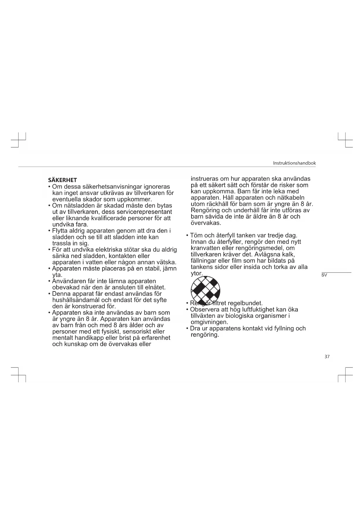- Dra ur apparatens kontakt vid fyllning och rengöring. SVInstruktionshandbok