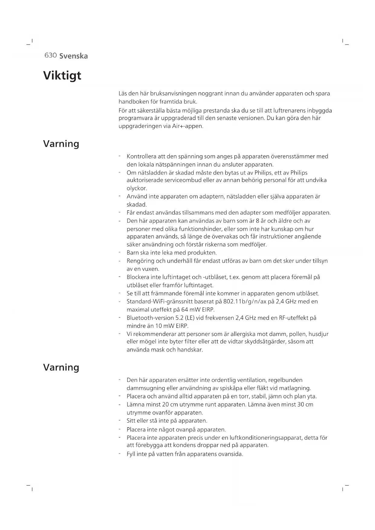 Svenska Viktigt Läs den här bruksanvisningen noggrant innan du använder apparaten och spara handboken för framtida bruk. För att säkerställa bästa möjliga prestanda ska du se till att luftrenarens inbyggda programvara är uppgraderad till den senaste versionen. Du kan göra den här uppgraderingen via Air+-appen. Varning