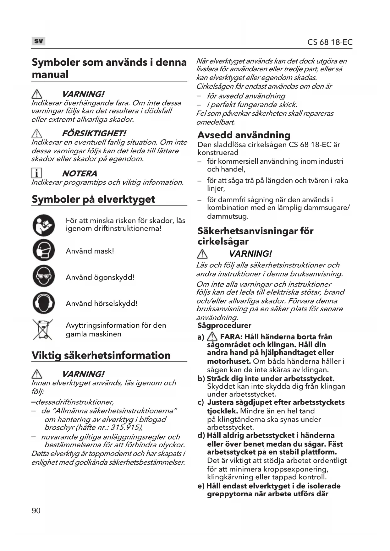 för dammfri sågning när den används i kombination med en lämplig dammsugare/dammutsug. Säkerhetsanvisningar för cirkelsågar VARNING! Läs och följ alla säkerhetsinstruktioner och andra instruktioner i denna bruksanvisning.Om inte alla varningar och instruktioner följs kan det leda till elektriska stötar, brand och/eller allvarliga skador. Förvara denna bruksanvisning på en säker plats för senare användning.Sågprocedurer