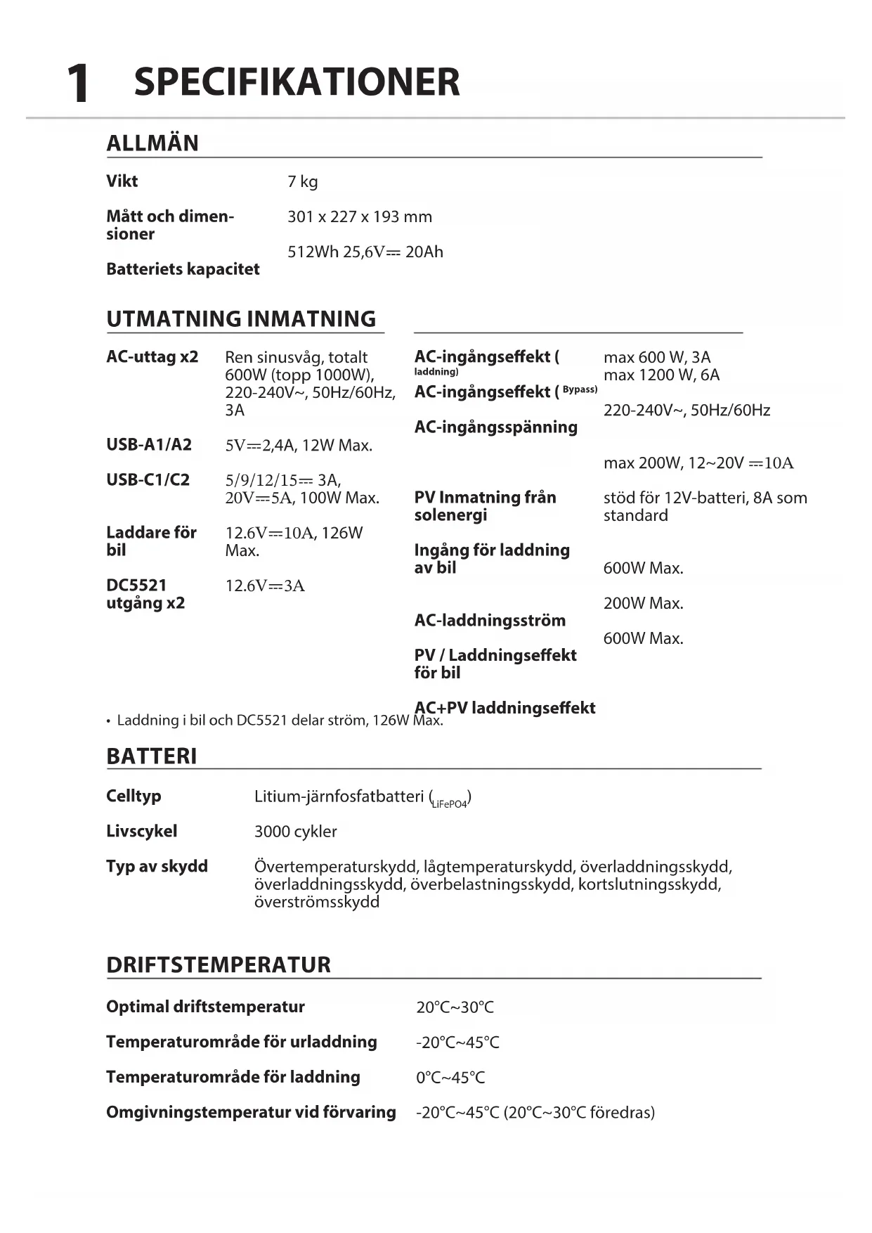 3000 cykler Övertemperaturskydd, lågtemperaturskydd, överladdningsskydd, överladdningsskydd, överbelastningsskydd, kortslutningsskydd, överströmsskydd 20°C~30°C -20°C~45°C 0°C~45°C -20°C~45°C (20°C~30°C föredras) max 600 W, 3A max 1200 W, 6A 220-240V~, 50Hz/60Hz max 200W, 12~20V ⎓10A stöd för 12V-batteri, 8A som standard 600W Max. 200W Max. 600W Max.