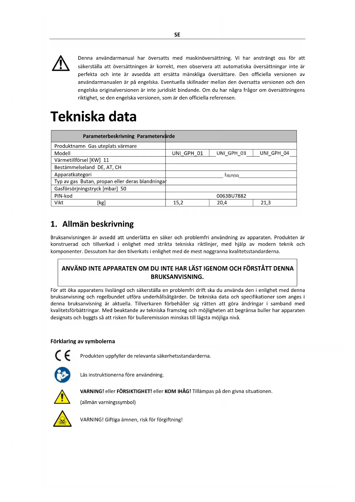 Bruksanvisningen är avsedd att underlätta en säker och problemfri användning av apparaten. Produkten är konstruerad och tillverkad i enlighet med strikta tekniska riktlinjer, med hjälp av modern teknik och komponenter. Dessutom har den tilverkats i enlighet med de mest noggranna kvalitetsstandarderna. ANVÄND INTE APPARATEN OM DU INTE HAR LÄST IGENOM OCH FÖRSTÅTT DENNA BRUKSANVISNING. För att öka apparatens livslängd och säkerställa en problemfri drift ska du använda den i enlighet med denna bruksanvisning och regelbundet utföra underhållsåtgärder. De tekniska data och specifikationer som anges i denna bruksanvisning är aktuella. Tillverkaren förbehåller sig rätten att göra ändringar i samband med kvalitetsförbättringar. Med beaktande av tekniska framsteg och möjligheten att begränsa buller har apparaten designats och byggts så att risken för bulleremission minskas till lägsta möjliga nivå. Förklaring av symbolerna Produkten uppfyller de relevanta säkerhetsstandarderna. Läs instruktionerna före användning. VARNING! eller FÖRSIKTIGHET! eller KOM IHÅG! Tillämpas på den givna situationen. (allmän varningssymbol) VARNING! Giftiga ämnen, risk för förgiftning!SE Rör ej! UPPMÄRKSAMHET! Het yta, risk för brännskador! OBSERVERA! Illustrationerna i denna bruksanvisning är endast avsedda som referens och vissa detaljer kan skilja sig från den faktiska produkten.