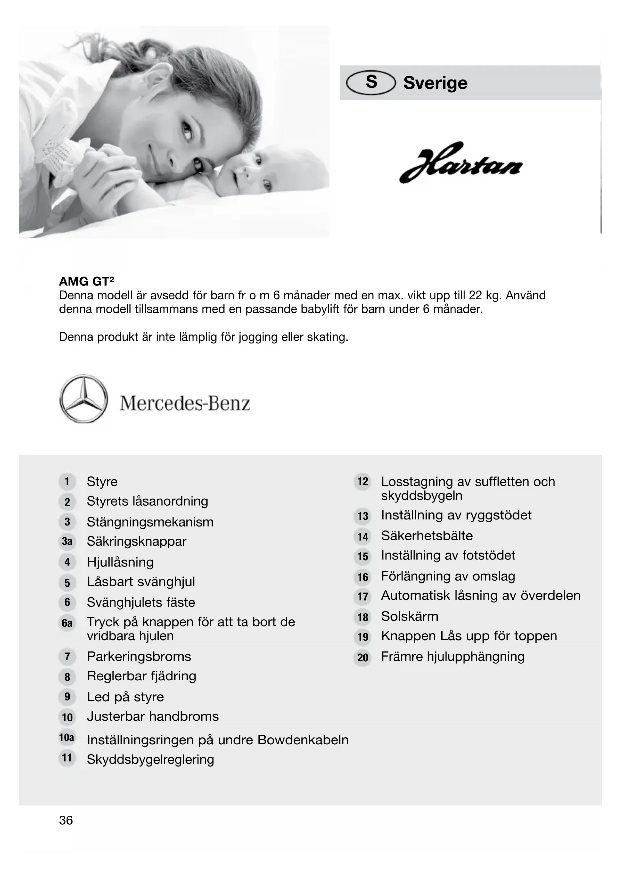 AMG GT² Denna modell är avsedd för barn fr o m 6 månader med en max. vikt upp till 22 kg. Använd denna modell tillsammans med en passande babylift för barn under 6 månader. Denna produkt är inte lämplig för jogging eller skating. Styre Styrets låsanordning Stängningsmekanism Säkringsknappar Hjullåsning Låsbart svänghjul Svänghjulets fäste Tryck på knappen för att ta bort de vridbara hjulen Parkeringsbroms Reglerbar fjädring Led på styre Justerbar handbroms Inställningsringen på undre Bowdenkabeln Skyddsbygelreglering Losstagning av suffletten och skyddsbygeln Inställning av ryggstödet Säkerhetsbälte Inställning av fotstödet Förlängning av omslag Automatisk låsning av överdelen Solskärm Knappen Lås upp för toppen Främre hjulupphängning