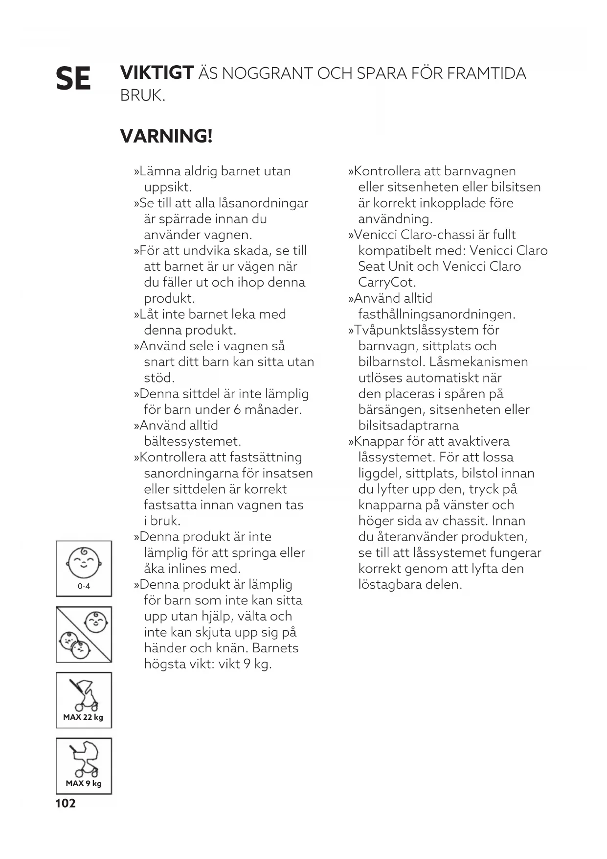 VIKTIGT ÄS NOGGRANT OCH SPARA FÖR FRAMTIDA BRUK. VARNING! » Lämna aldrig barnet utan uppsikt. » Se till att alla låsanordningar är spärrade innan du använder vagnen. » För att undvika skada, se till att barnet är ur vägen när du fäller ut och ihop denna produkt. » Låt inte barnet leka med denna produkt. » Använd sele i vagnen så snart ditt barn kan sitta utan stöd. » Denna sittdel är inte lämplig för barn under 6 månader. » Använd alltid bältessystemet. » Kontrollera att fastsättning sanordningarna för insatsen eller sittdelen är korrekt fastsatta innan vagnen tas i bruk. » Denna produkt är inte lämplig för att springa eller åka inlines med. » Denna produkt är lämplig för barn som inte kan sitta upp utan hjälp, välta och inte kan skjuta upp sig på händer och knän. Barnets högsta vikt: vikt 9 kg. » Kontrollera att barnvagnen eller sitsenheten eller bilsitsen är korrekt inkopplade före användning. » Venicci Claro-chassi är fullt kompatibelt med: Venicci Claro Seat Unit och Venicci Claro CarryCot. » Använd alltid fasthållningsanordningen. » Tvåpunktslåssystem för barnvagn, sittplats och bilbarnstol. Låsmekanismen utlöses automatiskt när den placeras i spåren på bärsängen, sitsenheten eller bilsitsadaptrarna » Knappar för att avaktivera låssystemet. För att lossa liggdel, sittplats, bilstol innan du lyfter upp den, tryck på knapparna på vänster och höger sida av chassit. Innan du återanvänder produkten, se till att låssystemet fungerar korrekt genom att lyfta den löstagbara delen. 0-4 MAX 22 kgMAX 9 kg103 VARNING!
