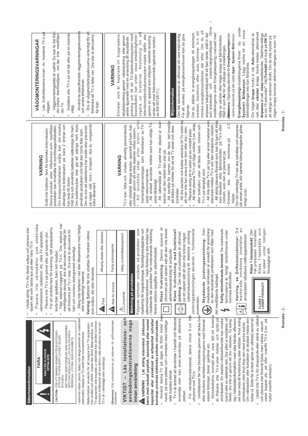 | För auf andra källa: Tryck auf kontrollknappen für att visa myen für Funktionaltentativ. | ViktIGT: TV:n ar assedd for drift fratt att uttag p 220-240 V xelstrom, 50 Hz. Efter att TV:n packats upp, ldet den na den omgivate temperature innan du ansluter TV:n till huvudströmmen. |