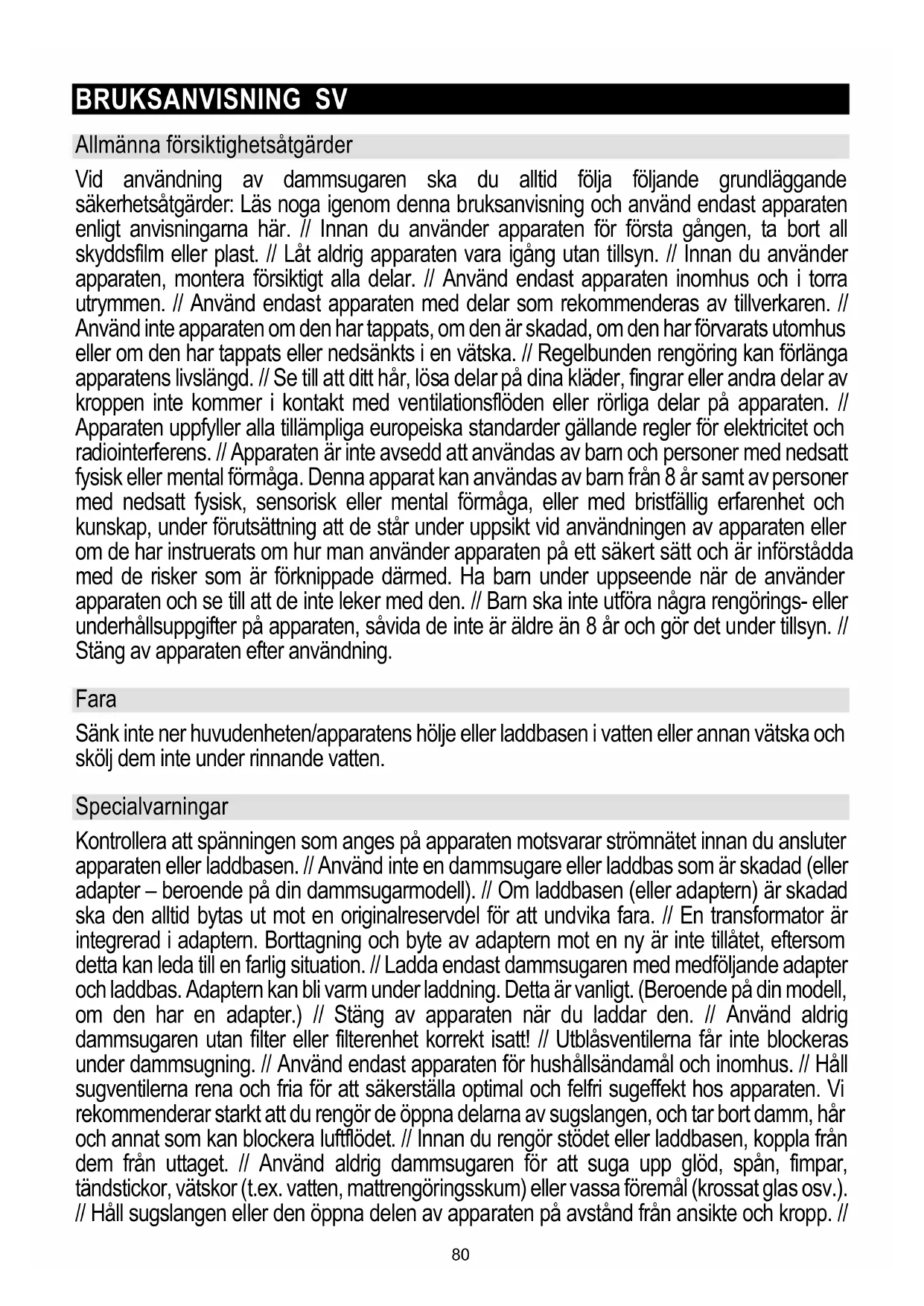 Når apparatet ikke lenger skal brukes, må du huske å avhende det på en miljøriktig måte. Batteriet må tas ut før du avhender støvsugeren. // For å fjerne batteriet på en trygg måte må du kontrollere at batteriet er helt utladet. Hvis batteriet i apparatet ikke kan tas ut, må du følge instruksjonene på illustrasjonene i bruksanvisningen. FEILKODER Feil 1 Batteriet begynner å bli dårlig og må skiftes ut. Feil 2 NTC-sensoren viser en feilfunksjon. Dette betyr at batteriet må skiftes ut eller repareres av fagfolk. Feil 10 Signalledningen til sugemotoren er defekt og må repareres av fagfolk. Feil 11 Apparatet virker ikke og må repareres av fagfolk. Feil 12 Driftsstrømmen er for høy eller tekstilmunnstykket og gulvmunnstykket er defekte og må repareres av fagfolk. Feil 13 Batteriet er satt feil i. Sett batteriet riktig i – se hurtigveiledning for isetting av batteri. Selv om batteriet er satt i, viser OLED-en fremdeles en feil og må repareres av fagfolk. Feil 14 Børstevalsen på gulvmunnstykket virker ikke når den er montert på munnstykket, og gulvmunnstykket har en strømfeil og må leveres inn til fagfolk for reparasjon. Feil 104 Ladestrømmen er for høy, slik at laderen ikke fungerer. Skift ut laderen. Feil 105 Ladespenningen er for høy, slik at laderen ikke fungerer. Skift ut laderen. Feil 106 Hvis ladetemperaturen er for høy, må du vente i 60 minutter før du starter ladingen. Hvis feilen vedvarer etter dette, må laderen skiftes ut. Feil 107 Hvis temperaturen i apparatet eller i omgivelsene er for høy når apparatet brukes med høy hastighet, anbefaler vi at du venter i 60 minutter før du fortsetter støvsugingen. Blokkert børstevalse Kontroller om det er noe rusk som blokkerer luftstrømmen i slangen. Sjekk hurtigveiledningen for riktig fjerning av børstevalsen. Løsne valsen fra munnstykket og rengjør børsten. Kontroller at det ikke er noe med rusk i slangen. Feil 109 Ladetiden overskrider 6 timer, dette tyder på feil med laderen slik at laderen må skiftes ut. Feil 110 Sugemotorens overspenningsvern utløses. Må leveres til kvalifiserte fagfolk for reparasjon. Feil 111 Sugemotorens overstrømsvern utløses. Må leveres til kvalifiserte fagfolk for reparasjon. Feil 112 Sugemotorens overopphetingsvern utløses, og fører til umiddelbar utkobling av apparatet. Må leveres til kvalifiserte fagfolk for reparasjon. Blokkert luftstrøm Motoren overskrider den optimale hastigheten på høy hastighet. Slangen er blokkert. // Filteret er blokkert. // Merk! Kontroller at filtersilen, filteret og støvbeholderen er tørre og på plass før bruk. Feil 120 Hvis filteret og støvbeholderen er fjernet, vil støvsugeren ikke virke. 79BRUKSANVISNING SV Allmänna försiktighetsåtgärder Vid användning av dammsugaren ska du alltid följa följande grundläggande säkerhetsåtgärder: Läs noga igenom denna bruksanvisning och använd endast apparaten enligt anvisningarna här. // Innan du använder apparaten för första gången, ta bort all skyddsfilm eller plast. // Låt aldrig apparaten vara igång utan tillsyn. // Innan du använder apparaten, montera försiktigt alla delar. // Använd endast apparaten inomhus och i torra utrymmen. // Använd endast apparaten med delar som rekommenderas av tillverkaren. // Använd inte apparaten om den har tappats, om den är skadad, om den har förvarats utomhus eller om den har tappats eller nedsänkts i en vätska. // Regelbunden rengöring kan förlänga apparatens livslängd. // Se till att ditt hår, lösa delar på dina kläder, fingrar eller andra delar av kroppen inte kommer i kontakt med ventilationsflöden eller rörliga delar på apparaten. // Apparaten uppfyller alla tillämpliga europeiska standarder gällande regler för elektricitet och radiointerferens. // Apparaten är inte avsedd att användas av barn och personer med nedsatt fysisk eller mental förmåga. Denna apparat kan användas av barn från 8 år samt av personer med nedsatt fysisk, sensorisk eller mental förmåga, eller med bristfällig erfarenhet och kunskap, under förutsättning att de står under uppsikt vid användningen av apparaten eller om de har instruerats om hur man använder apparaten på ett säkert sätt och är införstådda med de risker som är förknippade därmed. Ha barn under uppseende när de använder apparaten och se till att de inte leker med den. // Barn ska inte utföra några rengörings- eller underhållsuppgifter på apparaten, såvida de inte är äldre än 8 år och gör det under tillsyn. // Stäng av apparaten efter användning. Fara Sänk inte ner huvudenheten/apparatens hölje eller laddbasen i vatten eller annan vätska och skölj dem inte under rinnande vatten. Specialvarningar Kontrollera att spänningen som anges på apparaten motsvarar strömnätet innan du ansluter apparaten eller laddbasen. // Använd inte en dammsugare eller laddbas som är skadad (eller adapter – beroende på din dammsugarmodell). // Om laddbasen (eller adaptern) är skadad ska den alltid bytas ut mot en originalreservdel för att undvika fara. // En transformator är integrerad i adaptern. Borttagning och byte av adaptern mot en ny är inte tillåtet, eftersom detta kan leda till en farlig situation. // Ladda endast dammsugaren med medföljande adapter och laddbas. Adaptern kan bli varm under laddning. Detta är vanligt. (Beroende på din modell, om den har en adapter.) // Stäng av apparaten när du laddar den. // Använd aldrig dammsugaren utan filter eller filterenhet korrekt isatt! // Utblåsventilerna får inte blockeras under dammsugning. // Använd endast apparaten för hushållsändamål och inomhus. // Håll sugventilerna rena och fria för att säkerställa optimal och felfri sugeffekt hos apparaten. Vi rekommenderar starkt att du rengör de öppna delarna av sugslangen, och tar bort damm, hår och annat som kan blockera luftflödet. // Innan du rengör stödet eller laddbasen, koppla från dem från uttaget. // Använd al