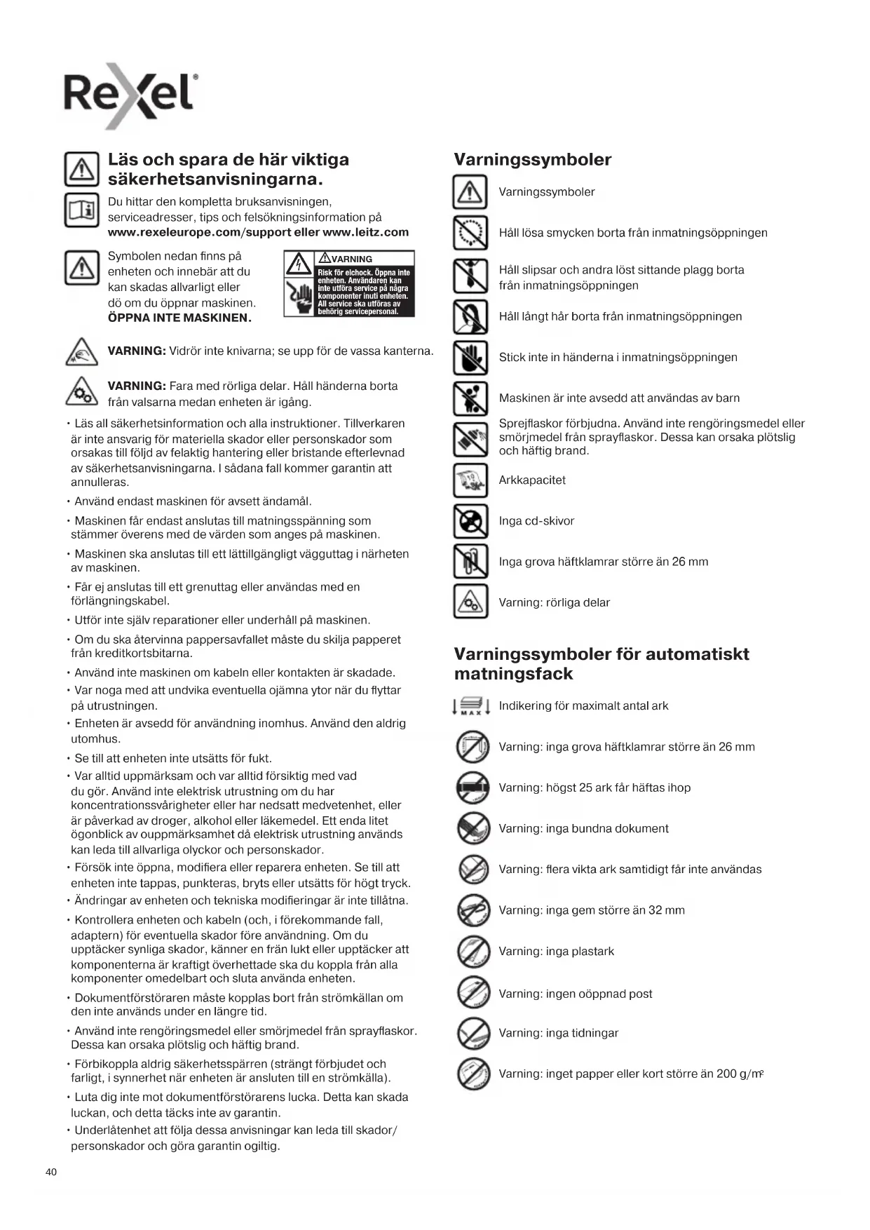 - Underlåtenhet att följa dessa anvisningar kan leda till skador/ personskador och göra garantin ogiltig. Läs och spara de här viktiga säkerhetsanvisningarna. Du hittar den kompletta bruksanvisningen, serviceadresser, tips och felsökningsinformation på www.rexeleurope.com/support eller www.leitz.com Håll lösa smycken borta från inmatningsöppningen Håll slipsar och andra löst sittande plagg borta från inmatningsöppningen Varningssymboler Håll långt hår borta från inmatningsöppningen Stick inte in händerna i inmatningsöppningen Varningssymboler Arkkapacitet Inga cd-skivor Inga grova häftklamrar större än 26 mm Varning: rörliga delar VARNING: Vidrör inte knivarna; se upp för de vassa kanterna. VARNING: Fara med rörliga delar. Håll händerna borta från valsarna medan enheten är igång. Maskinen är inte avsedd att användas av barn Sprejflaskor förbjudna. Använd inte rengöringsmedel eller smörjmedel från sprayflaskor. Dessa kan orsaka plötslig och häftig brand. Varning: inga grova häftklamrar större än 26 mm Varning: inga bundna dokument Varning: högst 25 ark får häftas ihop Varningssymboler för automatiskt matningsfack Varning: flera vikta ark samtidigt får inte användas Varning: inga gem större än 32 mm Indikering för maximalt antal ark Varning: inga tidningar Varning: inget papper eller kort större än 200 g/m