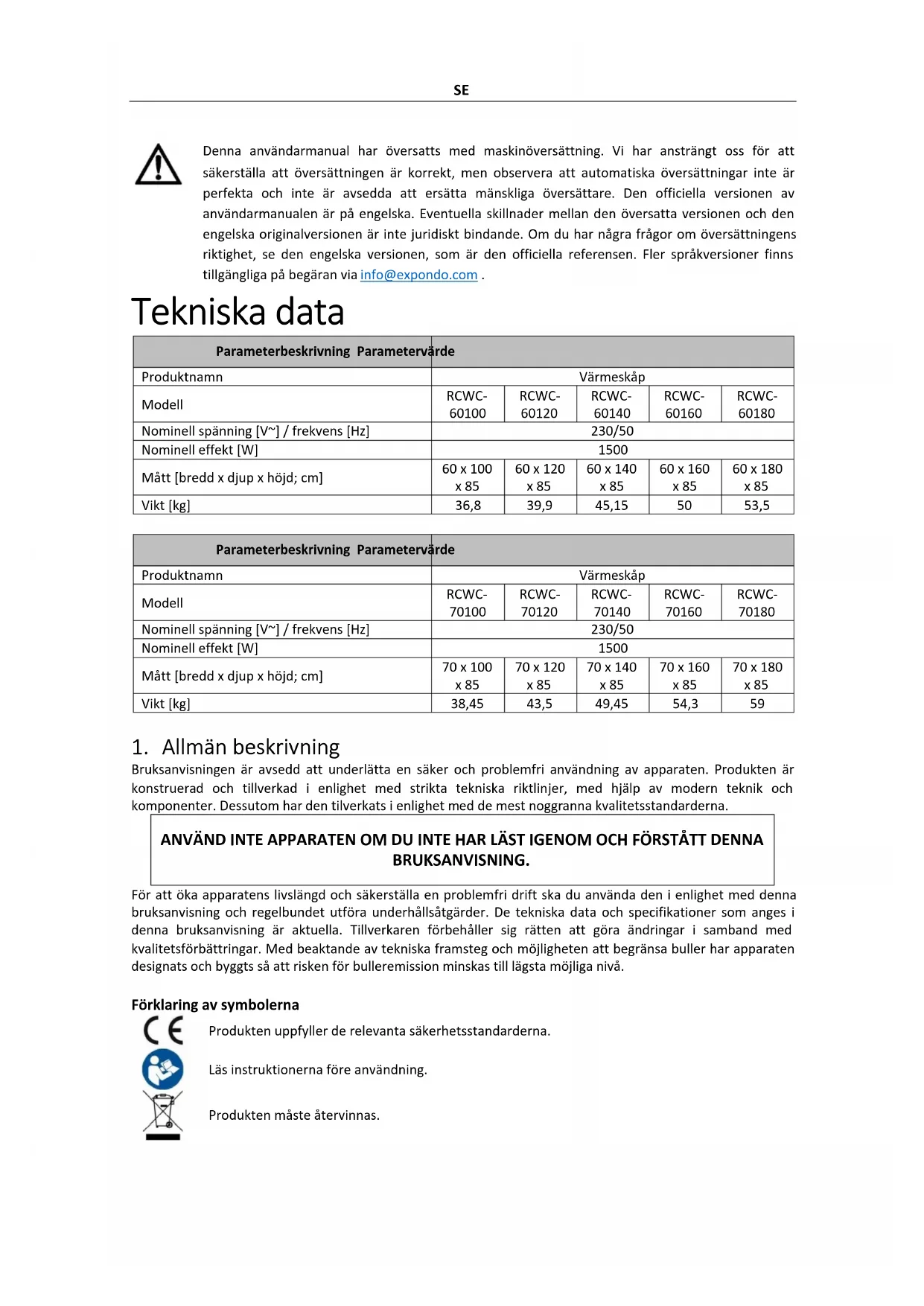 skader. j) Bruk en myk, fuktig klut til rengjøring. k) Ikke bruk skarpe gjenstander og/eller metallgjenstander til rengjøring (f.eks. stålbørste eller metallspatel), da disse kan skade apparatets overflatemateriale. l) Enheten må ikke rengjøres med syreholdige stoffer, medisinske midler, fortynningsmidler, drivstoff, oljer eller andre kjemiske stoffer, da dette kan skade enheten. KASSERING AV BRUKTE ENHETER: Apparatet må ikke kastes i det kommunale avfallssystemet. Lever den til et gjenvinnings- og innsamlingssted for elektriske apparater. Kontroller symbolet på produktet, bruksanvisningen og emballasjen. Plasten som brukes til å konstruere enheten, kan resirkuleres i henhold til merkingen. Når du velger å resirkulere, gir du et viktig bidrag til å beskytte miljøet. Kontakt lokale myndigheter for informasjon om ditt lokale gjenvinningsanlegg.SE Denna användarmanual har översatts med maskinöversättning. Vi har ansträngt oss för att säkerställa att översättningen är korrekt, men observera att automatiska översättningar inte är perfekta och inte är avsedda att ersätta mänskliga översättare. Den officiella versionen av användarmanualen är på engelska. Eventuella skillnader mellan den översatta versionen och den engelska originalversionen är inte juridiskt bindande. Om du har några frågor om översättningens riktighet, se den engelska versionen, som är den officiella referensen. Fler språkversioner finns tillgängliga på begäran via info@expondo.com . Tekniska data Parameterbeskrivning Parametervärde Produktnamn Värmeskåp Modell RCWC-
