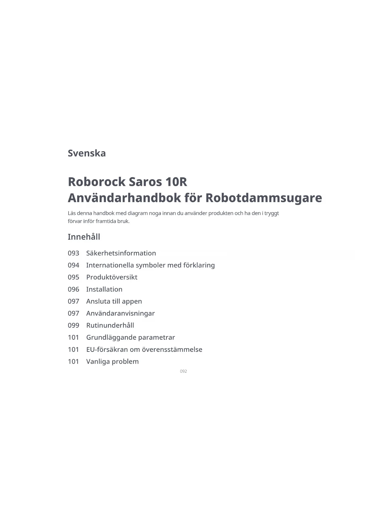 Rengör efter behov. Grundläggande parametrar Modell S91COP Batteri 14,4 V/6 400 mAh (TYP) litiumjonbatteri Angiven märkeffekt 20 VDC 2,5 A Laddningstid Cirka 3 timmar Robot Serienumret finns på ett klistermärke på robotens undersida. Obs: Station för tömning, rengöring och påfyllning Modell EWFD28HRR Nätspänning 220–240 VAC Angiven frekvens 50–60 Hz Angiven märkeffekt (dammuppsamling) 3 A Angiven märkeffekt (Mopptvätt med varmvatten) 6 A Angiven märkeffekt (Laddning och torkning) 0,8 A Angiven uteffekt 20 VDC 2,5 A Ta bort rengöringstrågets modul. Ta bort rengöringstråget och filtret från modulen och skölj dem med vatten. Sätt tillbaka filtret och rengöringstråget. Sätt sedan tillbaka rengöringstrågets modul. Vanliga problem Skanna QR-koden nedan för att visa Vanliga problem. EU-försäkran om överensstämmelse Härmed förklarar Beijing Roborock Technology Co., Ltd. att radioutrustningen av typen S91COP överensstämmer med direktiv 2014/53/EU. Hela texten EU-försäkran om överensstämmelse finns på följande internetadress: https://global.roborock.com/ pages/compliance102 Roborock Saros 10R Português Leia atentamente este manual do utilizador com diagramas antes de utilizar este produto e guarde-o devidamente para referência futura. Índice Manual do utilizador do aspirador robô 103 Informações de segurança 104 Explicação dos símbolos internacionais 105 Visão geral do produto 106 Instalação 107 Ligar à aplicação 107 Instruções de utilização 109 Manutenção de rotina 111 Parâmetros básicos 111 Declaração de Conformidade da UE 111 Problemas comuns103 Restrições Informações de segurança AVISO