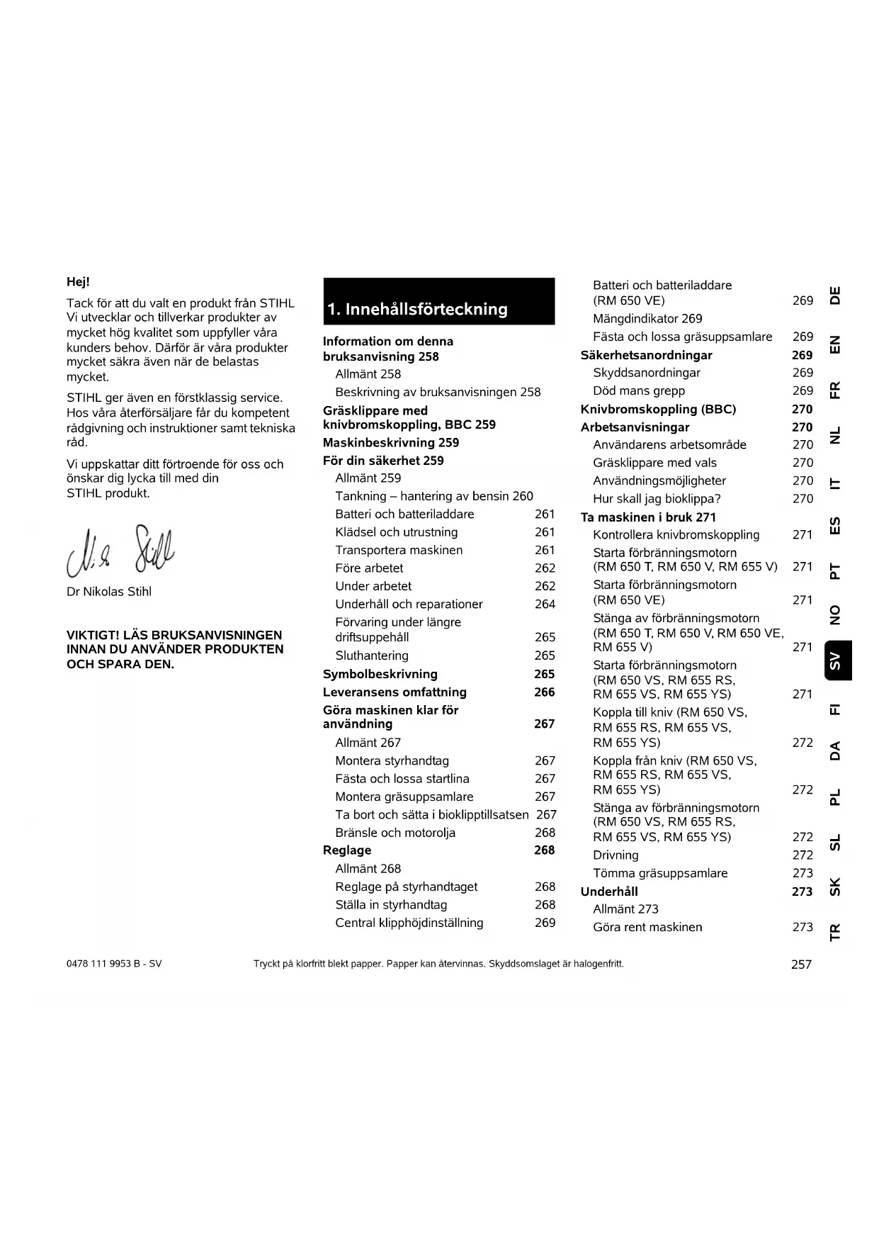 Information om denna bruksanvisning 258 Allmänt 258 Beskrivning av bruksanvisningen 258 Gräsklippare med knivbromskoppling, BBC 259 Maskinbeskrivning 259 För din säkerhet 259 Allmänt 259 Tankning – hantering av bensin 260 Batteri och batteriladdare 261 Klädsel och utrustning 261 Transportera maskinen 261 Före arbetet 262 Under arbetet 262 Underhåll och reparationer 264 Förvaring under längre driftsuppehåll 265 Sluthantering 265 Symbolbeskrivning 265 Leveransens omfattning 266 Göra maskinen klar för användning 267 Allmänt 267 Montera styrhandtag 267 Fästa och lossa startlina 267 Montera gräsuppsamlare 267 Ta bort och sätta i bioklipptillsatsen 267 Bränsle och motorolja 268 Reglage 268 Allmänt 268 Reglage på styrhandtaget 268 Ställa in styrhandtag 268 Central klipphöjdinställning 269 Batteri och batteriladdare (RM 650 VE) 269 Mängdindikator 269 Fästa och lossa gräsuppsamlare 269 Säkerhetsanordningar 269 Skyddsanordningar 269 Död mans grepp 269 Knivbromskoppling (BBC) 270 Arbetsanvisningar 270 Användarens arbetsområde 270 Gräsklippare med vals 270 Användningsmöjligheter 270 Hur skall jag bioklippa? 270 Ta maskinen i bruk 271 Kontrollera knivbromskoppling 271 Starta förbränningsmotorn (RM 650 T, RM 650 V, RM 655 V) 271 Starta förbränningsmotorn (RM 650 VE) 271 Stänga av förbränningsmotorn (RM 650 T, RM 650 V, RM 650 VE, RM 655 V) 271 Starta förbränningsmotorn (RM 650 VS, RM 655 RS, RM 655 VS, RM 655 YS) 271 Koppla till kniv (RM 650 VS, RM 655 RS, RM 655 VS, RM 655 YS) 272 Koppla från kniv (RM 650 VS, RM 655 RS, RM 655 VS, RM 655 YS) 272 Stänga av förbränningsmotorn (RM 650 VS, RM 655 RS, RM 655 VS, RM 655 YS) 272 Drivning 272 Tömma gräsuppsamlare 273 Underhåll 273 Allmänt 273 Göra rent maskinen 2730478 111 9953 B - SV