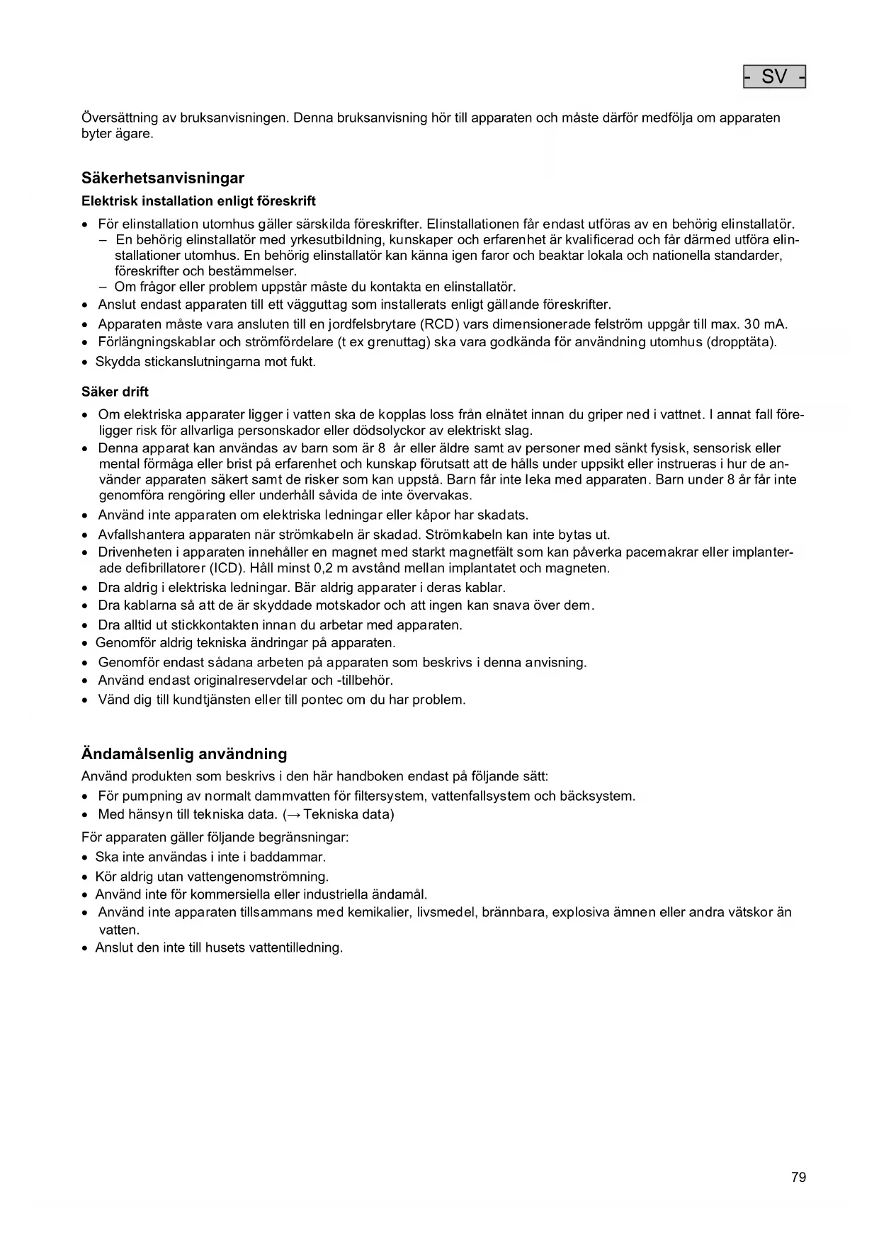 Installation och anslutning Pumpen kan installeras nedsänkt (i vatten) eller torrt (utanför vatten). Pumpen får endast användas om angivna vattenvärden beaktas. (→ Tekniska data)
