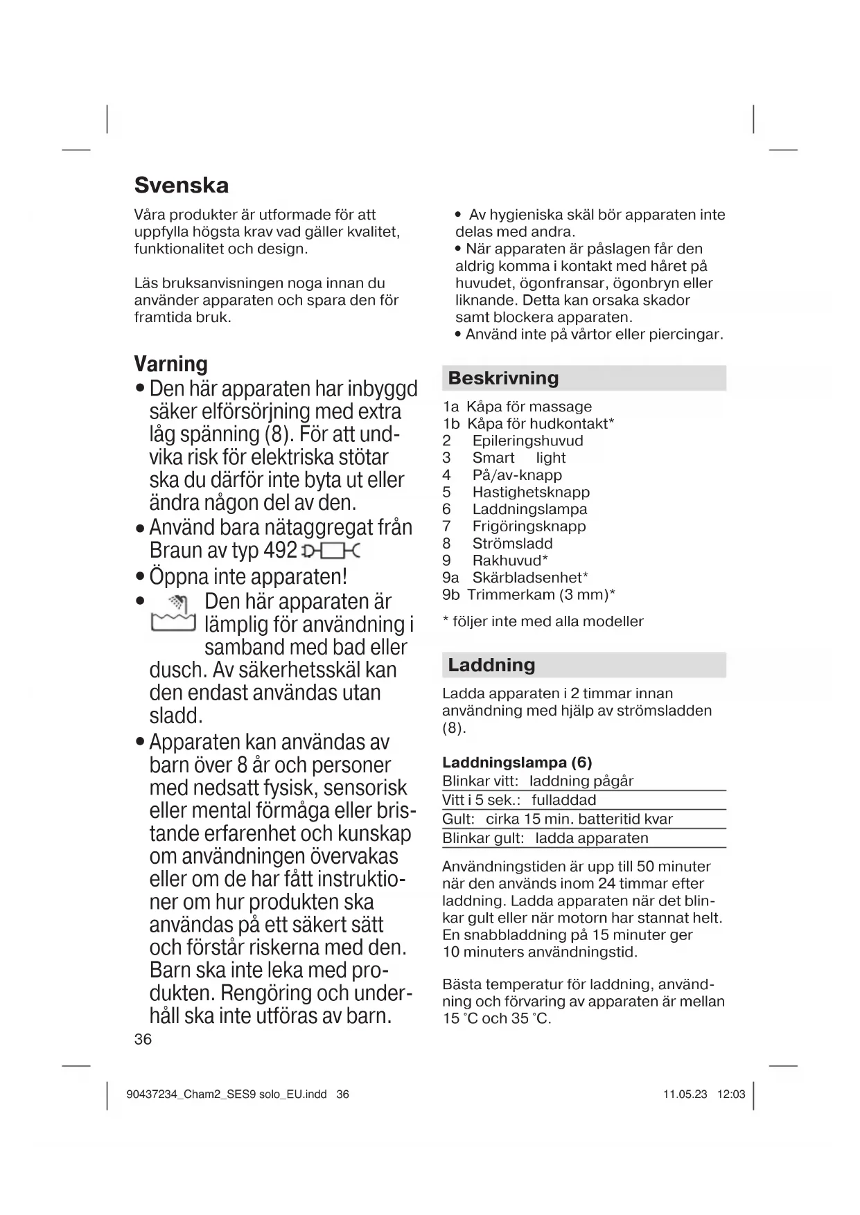 - Genom att exfoliera undviker du inåtväxande hårstrån och gör det enk- lare att epilera. Så här epilerar du Kontrollera att epileringshuvudet (2) är rent. Beroende på modell, sätt på en av kåporna: Massagerullekåpa (1a): för bästa komfort Kåpa för hudkontakt (1b): för ökad effektivitet Torranvändning: Se till att huden är torr och fri från fett och krämer. Våtanvändning: Se till att huden är ordentligt fuktad för att uppnå optimala glidförhållanden. Sträck alltid ut huden vid epilering. För apparaten med en långsam, kontinuerlig rörelse utan att trycka, mot hårstrånas växtriktning och i samma riktning som ljuset. Ben: Håll benet utsträckt när du epilerar bakom knät. Känsliga områden: Rengör området noggrant före epilering för att avlägsna rester (t.ex. deodorant) och torka omsorgsfullt. Håll armen 90437234_Cham2_SES9 solo_EU.indd 3790437234_Cham2_SES9 solo_EU.indd 37 11.05.23 12:0311.05.23 12:0338 sträckt uppåt när du epilerar armhålan, så att huden är sträckt, och för appara- ten i olika riktningar. Huden kan vara extra känslig efter epilering så vi rekom- menderar att du undviker att använda produkter som innehåller alkohol. Rengöra epileringshuvudet Stäng av apparaten och rengör epile- ringshuvudet efter användning: Avlägsna kåpan (1a/b). Borsta ur pincet- terna samtidigt som du snurrar manuellt på pincettdelen. Tryck på frigörningsk- nappen (7) för att avlägsna epilerings- huvudet. Knacka försiktigt för att avlägsna hårstrån från insidan. Om det behövs en grundlig rengöring håller du apparaten med epileringshuvu- det under rinnande varmt vatten. Ta sedan av epileringshuvudet och skaka det så att allt vatten kan rinna ut. Se till att det är torrt innan du sätter tillbaka det. Allmän information om epilering Alla hårborttagningsmetoder från roten kan leda till irritation (t.ex. klåda, obehag eller rodnad), beroende på hudens och hårstrånas kondition. Det är en normal reaktion och bör försvinna snabbt, men kan vara kraftigare när man avlägsnar hårstrån från roten de första gångerna eller om man har känslig hud. I allmänhet minskar förekomsten av hud- reaktioner och smärta avsevärt vid upp- repad användning. Om huden efter 36 timmar fortfarande visar tecken på irrita- tion, rekommenderar vi att du kontaktar läkare. Rengör epileringshuvudet och din hud noggrant före varje användning för att minimera risken för infektion eller inflam- mation p.g.a. bakterier som tränger in i huden med tanke på mikroskadorna. Om du känner dig osäker på om du kan använda den här produkten bör du råd- fråga läkare. Rådgör med läkare innan produkten används vid följande tillstånd: eksem, sår, inflammationer i huden såsom hårsäcksinflammation (follikulit), åderbråck, runt leverfläckar; på hud med nedsatt motståndskraft t.ex. vid diabetes mellitus, graviditet, Raynauds sjukdom; vid hemofili, svampinfektioner eller immunbrist. Rakning (B) Rakhuvudet (9) är utvecklat för en snabb och nära rakning av ben, under armarna och bikinilinjen. För bästa resul tat ska rakapparaten användas på torr hud. För att trimma hårstrån till 3 mm längd, sätt på trimmerkammen (9b) och för den platt mot huden med öppningen i hårstrånas växtriktning. Rengöring Skärbladet ska inte rengöras med bor- sten eftersom detta kan skada bladet. Avlägsna skärbladsenheten (9a) enligt bilden på sida 5. Knacka den mot en plan yta. Rengör rakhuvudet med borsten eller under rinnande vatten. Montera ihop den när den är torr igen. Smörj den regelbun- det (1. skärblad/