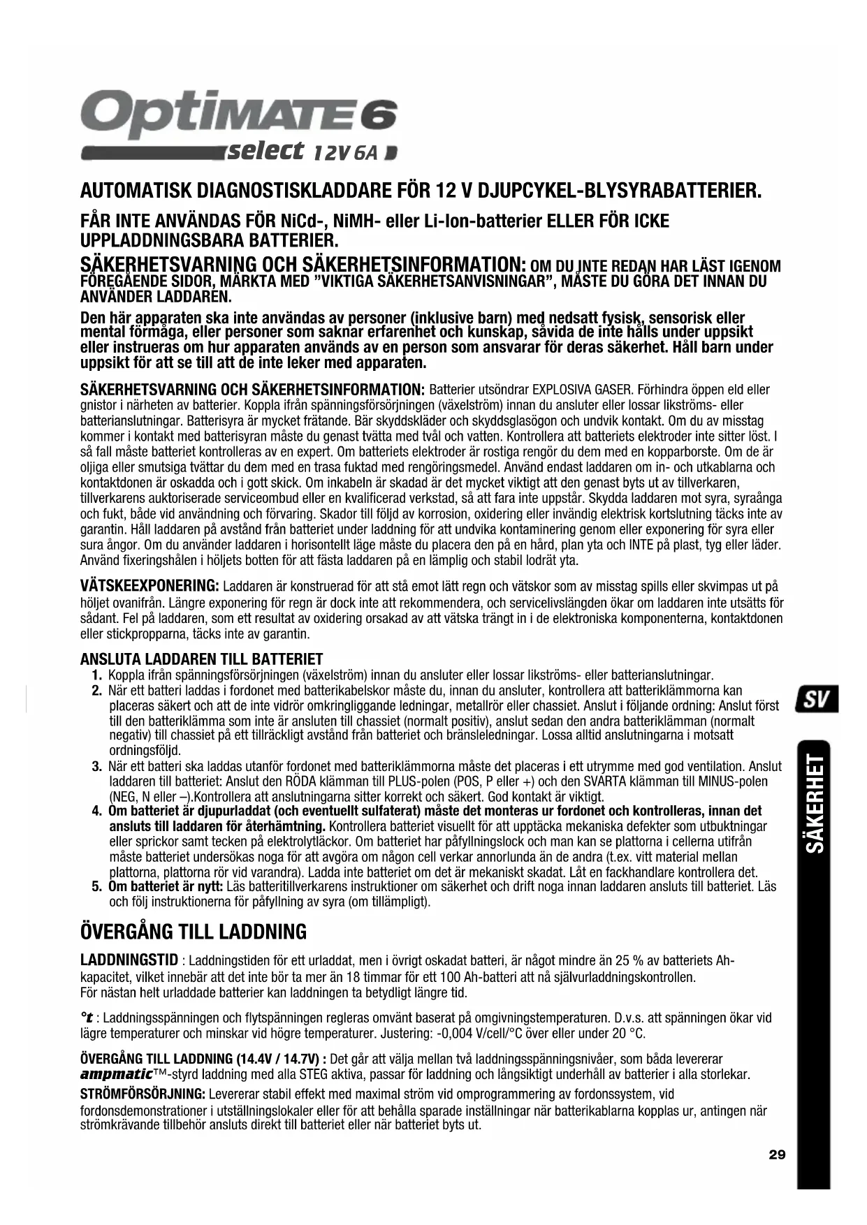 select AUTOMATISK DIAGNOSTISKLADDARE FÖR 12 V DJUPCYKEL-BLYSYRABATTERIER. FÅR INTE ANVÄNDAS FÖR NiCd-, NiMH- eller Li-Ion-batterier ELLER FÖR ICKE UPPLADDNINGSBARA BATTERIER. SÄKERHETSVARNING OCH SÄKERHETSINFORMATION: OM DU INTE REDAN HAR LÄST IGENOM FÖREGÅENDE SIDOR, MÄRKTA MED ”VIKTIGA SÄKERHETSANVISNINGAR”, MÅSTE DU GÖRA DET INNAN DU ANVÄNDER LADDAREN.Den här apparaten ska inte användas av personer (inklusive barn) med nedsatt fysisk, sensorisk eller mental förmåga, eller personer som saknar erfarenhet och kunskap, såvida de inte hålls under uppsikt eller instrueras om hur apparaten används av en person som ansvarar för deras säkerhet. Håll barn under uppsikt för att se till att de inte leker med apparaten. SÄKERHETSVARNING OCH SÄKERHETSINFORMATION: Batterier utsöndrar EXPLOSIVA GASER. Förhindra öppen eld eller gnistor i närheten av batterier. Koppla ifrån spänningsförsörjningen (växelström) innan du ansluter eller lossar likströms- eller batterianslutningar. Batterisyra är mycket frätande. Bär skyddskläder och skyddsglasögon och undvik kontakt. Om du av misstag kommer i kontakt med batterisyran måste du genast tvätta med tvål och vatten. Kontrollera att batteriets elektroder inte sitter löst. I så fall måste batteriet kontrolleras av en expert. Om batteriets elektroder är rostiga rengör du dem med en kopparborste. Om de är oljiga eller smutsiga tvättar du dem med en trasa fuktad med rengöringsmedel. Använd endast laddaren om in- och utkablarna och kontaktdonen är oskadda och i gott skick. Om inkabeln är skadad är det mycket viktigt att den genast byts ut av tillverkaren, tillverkarens auktoriserade serviceombud eller en kvalificerad verkstad, så att fara inte uppstår. Skydda laddaren mot syra, syraånga och fukt, både vid användning och förvaring. Skador till följd av korrosion, oxidering eller invändig elektrisk kortslutning täcks inte av garantin. Håll laddaren på avstånd från batteriet under laddning för att undvika kontaminering genom eller exponering för syra eller sura ångor. Om du använder laddaren i horisontellt läge måste du placera den på en hård, plan yta och INTE på plast, tyg eller läder. Använd fixeringshålen i höljets botten för att fästa laddaren på en lämplig och stabil lodrät yta. VÄTSKEEXPONERING: Laddaren är konstruerad för att stå emot lätt regn och vätskor som av misstag spills eller skvimpas ut på höljet ovanifrån. Längre exponering för regn är dock inte att rekommendera, och servicelivslängden ökar om laddaren inte utsätts för sådant. Fel på laddaren, som ett resultat av oxidering orsakad av att vätska trängt in i de elektroniska komponenterna, kontaktdonen eller stickpropparna, täcks inte av garantin.ANSLUTA LADDAREN TILL BATTERIET