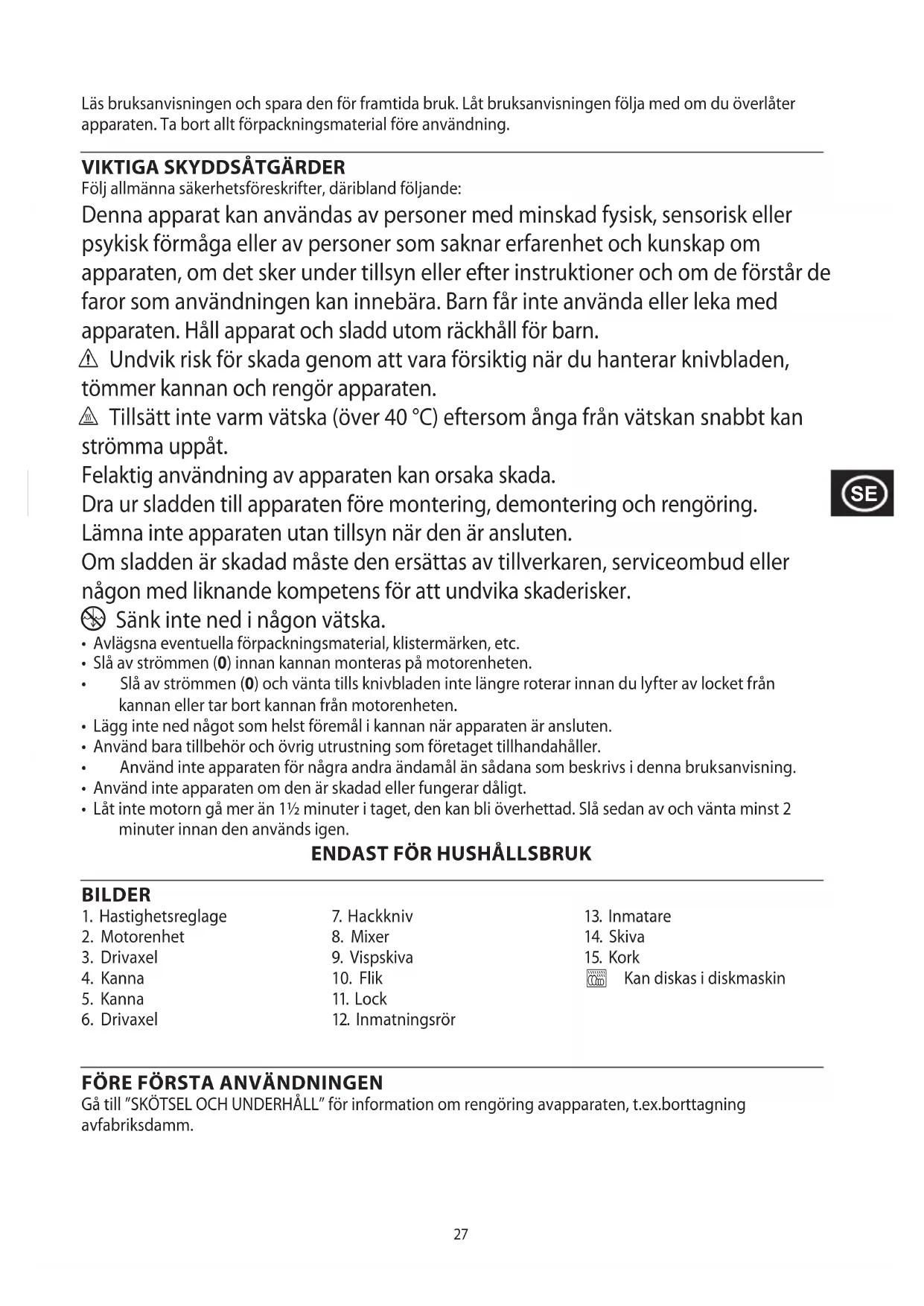 Följ allmänna säkerhetsföreskrifter, däribland följande: Denna apparat kan användas av personer med minskad fysisk, sensorisk eller psykisk förmåga eller av personer som saknar erfarenhet och kunskap om apparaten, om det sker under tillsyn eller efter instruktioner och om de förstår de faror som användningen kan innebära. Barn får inte använda eller leka med apparaten. Håll apparat och sladd utom räckhåll för barn. c Undvik risk för skada genom att vara försiktig när du hanterar knivbladen, tömmer kannan och rengör apparaten. h Tillsätt inte varm vätska (över 40 °C) eftersom ånga från vätskan snabbt kan strömma uppåt. Felaktig användning av apparaten kan orsaka skada. Dra ur sladden till apparaten före montering, demontering och rengöring. Lämna inte apparaten utan tillsyn när den är ansluten. Om sladden är skadad måste den ersättas av tillverkaren, serviceombud eller någon med liknande kompetens för att undvika skaderisker.
